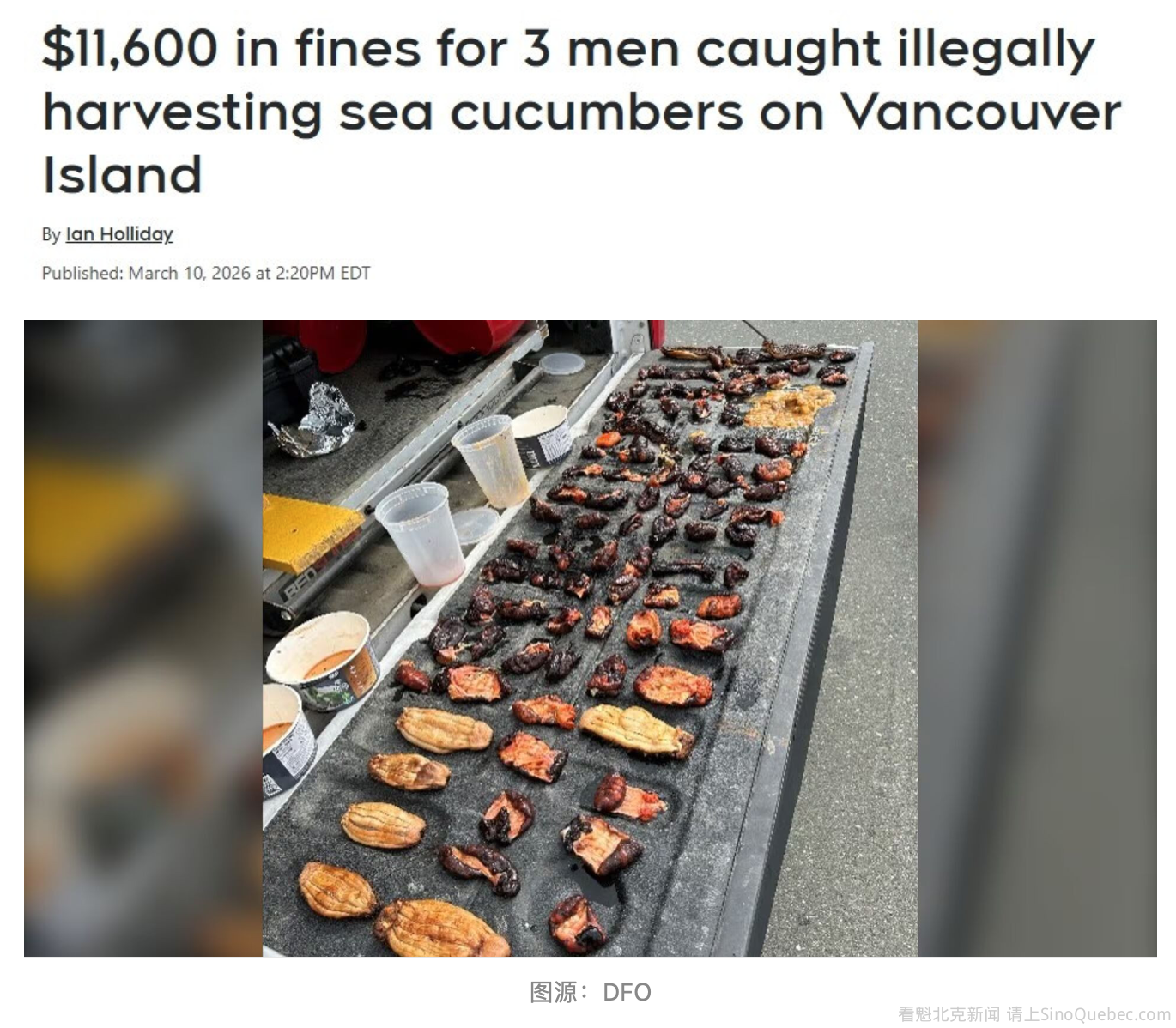 三名华人男子因在温哥华岛非法过量捕捞海参被罚款,总金额超过 1.1万加元。 加拿大渔业与海洋部(DFO)表示,2025年5月28日,Weng Sufeng、Wang Yuxuan和Dai Genjing在卑诗省坎贝尔河(Campbell River)的Willow Point海滩捕捞海参时,被执法人员发现。 当渔业执法人员在该区域进行检查并表明身份后,三人立刻试图把桶里的东西倒回海里。DFO在周二发布的新闻稿中表示:“当执法人员表明身份后,Weng、Wang和Dai立即试图将他们桶中的物品倒入海中。” 执法人员当场命令三人停止倾倒,并对其捕捞物进行检查。检查结果显示,桶中共有43只巨型红橙色海参。根据规定,海参每日每人最多只能持有12只。 DFO表示,所有仍然存活的海参都已被放回海中。在检查过程中,Weng还告诉执法人员,他的车辆里还有更多海参。 随后执法人员搜查车辆,在车内发现了数量不明的海参以及加工过的海胆。 根据DFO发布的信息,这三人分别在坎贝尔河省级法院经历了三次独立审理,最后一次审理在今年1月底结束。 最终,Weng被罚款6000加元,Wang被罚款2600加元,Dai被罚款3000加元。他们被认定违反了《加拿大渔业法》及相关法规,以及卑诗省的休闲捕鱼规定。 DFO表示,巨型红海参的休闲捕捞规模虽然不大,但受到严格管理,因为这种生物行动缓慢、资源较为脆弱。设置每日捕捞和持有上限,是为了确保资源可持续利用,保护长期种群数量,同时也保障依赖海参作为食物及文化用途的原住民社区。 部门强调,当有人超额捕捞时,就会对这一脆弱资源造成风险。 |