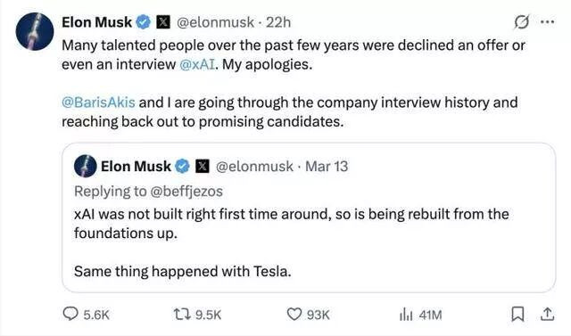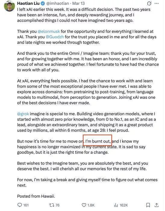 中新网3月14日电 (戴悦)近日,一向骄傲的马斯克难得低下了头,发文公开致歉。 在2月份与SpaceX合并后,世界首富埃隆·马斯克麾下的人工智能公司xAI内部出现了一波剧烈的人事震荡。 短短一个月内,与埃隆·马斯克共同创立xAI的“11罗汉”中,已有9人先后宣布离职。 3月13日,负责图像生成产品的创始成员张国栋发帖宣布离开公司。随后,另一名联合创始人刘浩天也在社交媒体上发文,确认早前自己也已离职,并直言“燃尽了”。 ![]() ![]() 刘浩天官宣离职,称“燃尽了” 据Business Insider援引知情人士称,联合创始人戴子航也已离开xAI,他的xAI徽章已从其xAI个人资料中消失。 而这三人并非首批出走者。今年1月以来,Toby Pohlen、Jimmy Ba、Tony Wu、Greg Yang等多名联合创始人已陆续离开。 至此,2023年与马斯克一起创立公司的11名创始成员(不包括马斯克本人)中,仅剩Manuel Kroiss和Ross Nordeen两人还在坚守。 面对核心团队几乎“团灭”的尴尬局面,一向以强硬著称的马斯克展现出罕见的自省姿态。 “过去几年里,许多有才华的人在申请加入xAI时被拒绝录用,甚至连面试机会都没有获得。对此我深表歉意。”马斯克在X平台上发文表示。 ![]() 马斯克发帖致歉 他透露,正与招聘负责人Baris Akis一起重新梳理公司的面试记录,将再次联系那些当时表现出潜力但被拒绝的候选人。 早前,马斯克曾发文承认,“xAI最初构建时并不完善,因此正在从头开始重建。特斯拉也经历过同样的情况。” 但事实上,这场人才地震,或许并非早期构建因素导致,而是与xAI和SpaceX的重组合并有关。 2月2日,马斯克宣布将xAI与其火箭公司SpaceX合并,合并后公司估值达1.25万亿美元。有知情人士透露,此次合并或许是为首次公开募股做准备。 10天后,xAI发布视频阐述公司未来愿景,马斯克转发并补充道:“为了提升执行效率,xAI几天前进行了重组。随着公司的发展,尤其像xAI这样快速成长的公司,其组织结构也必须像任何生物体一样不断演进。遗憾的是,这意味着我们不得不与一些人分道扬镳。” ![]() 马斯克称会与部分员工分道扬镳 这段看似温和的表态,揭开了此次大规模人事变动的序幕。 据《金融时报》报道,由于对编码部门业绩不满,马斯克从SpaceX和特斯拉引入了“fixers”对xAI进行审查,并以工作表现不佳为由解雇了数名员工。报道援引知情人士称,部分联合创始人实际上是“被迫离开”。 而马斯克也确实如其所说的正在重构xAI的内部人员结构。 就在张国栋离职当日, xAI成功从AI编码工具初创公司Cursor挖来产品与工程负责人Andrew Milich和工程负责人Jason Ginsberg,两人将直接向马斯克汇报。 |