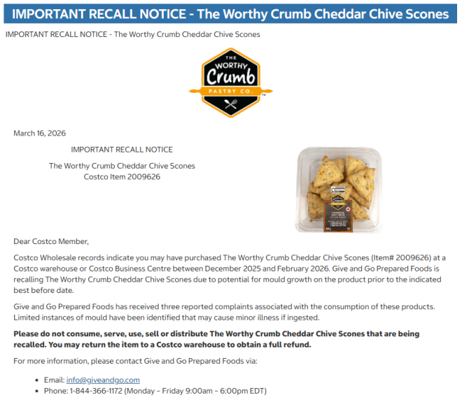 如果你最近在Costco买过烘焙食品,那你可能需要仔细检查一下了,因为该零售商刚刚发布了一项新的召回通知。 ![]() 图源:JHVEPhoto/Shutterstock 3月16日,加拿大Costco转发了生产商Give and Go Prepared Foods的一则公告,提醒顾客:由于可能存在发霉风险,一款热门烘焙产品正在被召回。 公司表示,他们发现“The Worthy Crumb Cheddar Chive Scones”(切达芝士香葱司康)在标注的最佳食用日期之前,可能就已经出现霉变。 ![]() 图源:加拿大Costco官网截图 Give and Go Prepared Foods表示,目前已收到三起与该产品相关的投诉,并称确实发现了少量发霉情况,如果食用,可能会引发轻微不适。 此次召回涉及的是2025年12月至2026年2月期间,在Costco门店或Costco商业中心销售的这款司康。产品为一盒9个装的切达芝士香葱司康,总重量为660克。 如果你家中有这款产品,请不要食用、不要招待他人、也不要转卖或分发。顾客可以将商品带回Costco门店,获得全额退款。 ![]() 图源:costcobusinesscentre.ca Canadian Food Inspection Agency(加拿大食品检验局,CFIA)也在3月9日发布了针对同一产品的召回通知,并将其归类为“三级召回”。 根据该机构的说明,三级召回指的是“食用后对健康造成不良影响的风险较低”。官网还写道:“这一类别也包括那些虽然不符合相关法规,但本身不会对健康构成风险的食品。” 顾客如有疑问,可以通过电话1 (844) 366-1172或邮箱info@giveandgo.com联系Give and Go Prepared Foods。 另外,加拿大Costco最近还宣布召回了多款产品,包括Delici Dubai Chocolate Mousse(迪拜巧克力慕斯)和Ajinomoto Yakitori Chicken Fried Rice(味之素日式照烧鸡炒饭)。 |