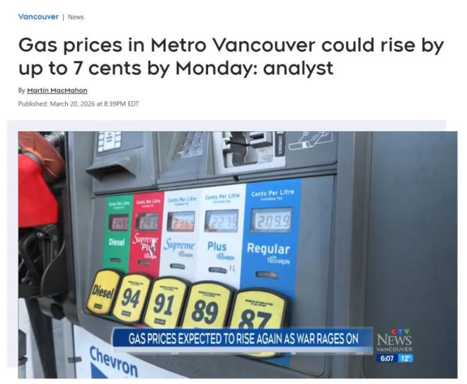 预计会在4月初发放。不过不少经济学家认为,这笔钱更多只是“缓一下”,很难真正抵消持续上涨的油价和食品价格。 而BC省这边,由于财政赤字扩大、信用评级被下调,政府可操作空间也在变小。今年暂时也没有类似过去那样的大规模生活成本补贴政策。 至于长期解决方案,省长曾提到增加本地炼油能力,以提高能源供应的稳定性。但现实情况是建一个炼油厂成本大约在150亿加元,投资周期长、回报不确定。同时BC又在推动减排和电动车政策,这对投资人来说,其实是一个矛盾信号——未来汽油需求可能下降,那现在投这么多钱,值不值得? ![]() 所以短期来看,一个很现实的结论是:没有快速解法。 而且,这种涨价也不是“所有人都在亏”。普通消费者,尤其是低收入群体,会承受最大压力;但石油公司,在供应紧张的情况下,反而可能获得更高利润。也正因为如此,有经济学家开始提出“暴利税”的想法,希望对超额利润进行再分配。 ![]() 说到底,这不是一次简单的油价波动,而是一整套连锁反应: 中东局势紧张 → 石油运输受阻 → 油价上涨 → 运输成本上升 → 食品和商品价格上涨。 而且更关键的是,这一轮上涨,很可能还没有到顶。 新闻信息来源:https://dailyhive.com/vancouver/vancouver-grocery-bills-climb https://www.ctvnews.ca/vancouver/article/gas-prices-in-metro-vancouver-could-rise-by-up-to-7-cents-by-monday-analyst/ |