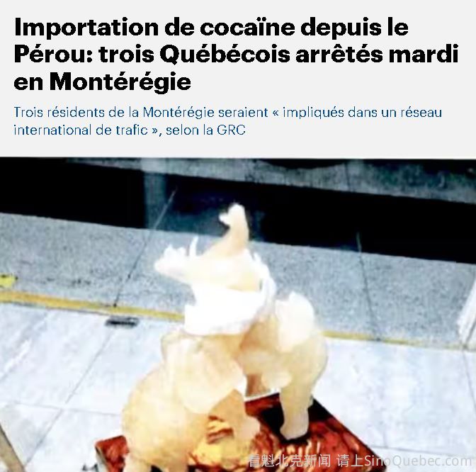 两人被控共谋持有可卡因以进行贩运,以及共谋进口可卡因。 另一名嫌疑人 Ahmad Ebad Ebadi,28岁,被控持有可卡因以进行贩运。 GRC 在声明中指出:“Provost 和 Rodrigues Da Costa 被指控共谋从秘鲁向魁北克进口大量可卡因;Ebadi 则被指控在蒙特利尔地区为该团伙运输毒品。” 今天三人须在 Longueuil 法院出庭。 此次警方行动代号“Projet Cache”,自 2022 年起进行,同时配合秘鲁国家警察调查。 秘鲁警方此前在 2023 年 2 月逮捕了包括三名其他魁北克人在内的八名嫌疑人,并查获前一年累计 164 公斤可卡因。 部分毒品被藏在小型雕像(大象和小丑造型)中,通过航空包裹运往魁北克;另一部分则用塑料薄膜包装,放入普通棕色纸箱中。 秘鲁警方还曾公开三名被捕嫌疑人跪地、周围全是全副武装警员的照片。 此前案件中,两名魁北克人 Frédéric Dewald 和 Francis Toupin-Bergevin 于去年 12 月被判 17 年监禁,Toupin-Bergevin 已提起上诉;另一名 Bô-Soleil Borin Lachance 于 2024 年 8 月被完全无罪释放,返回魁北克。