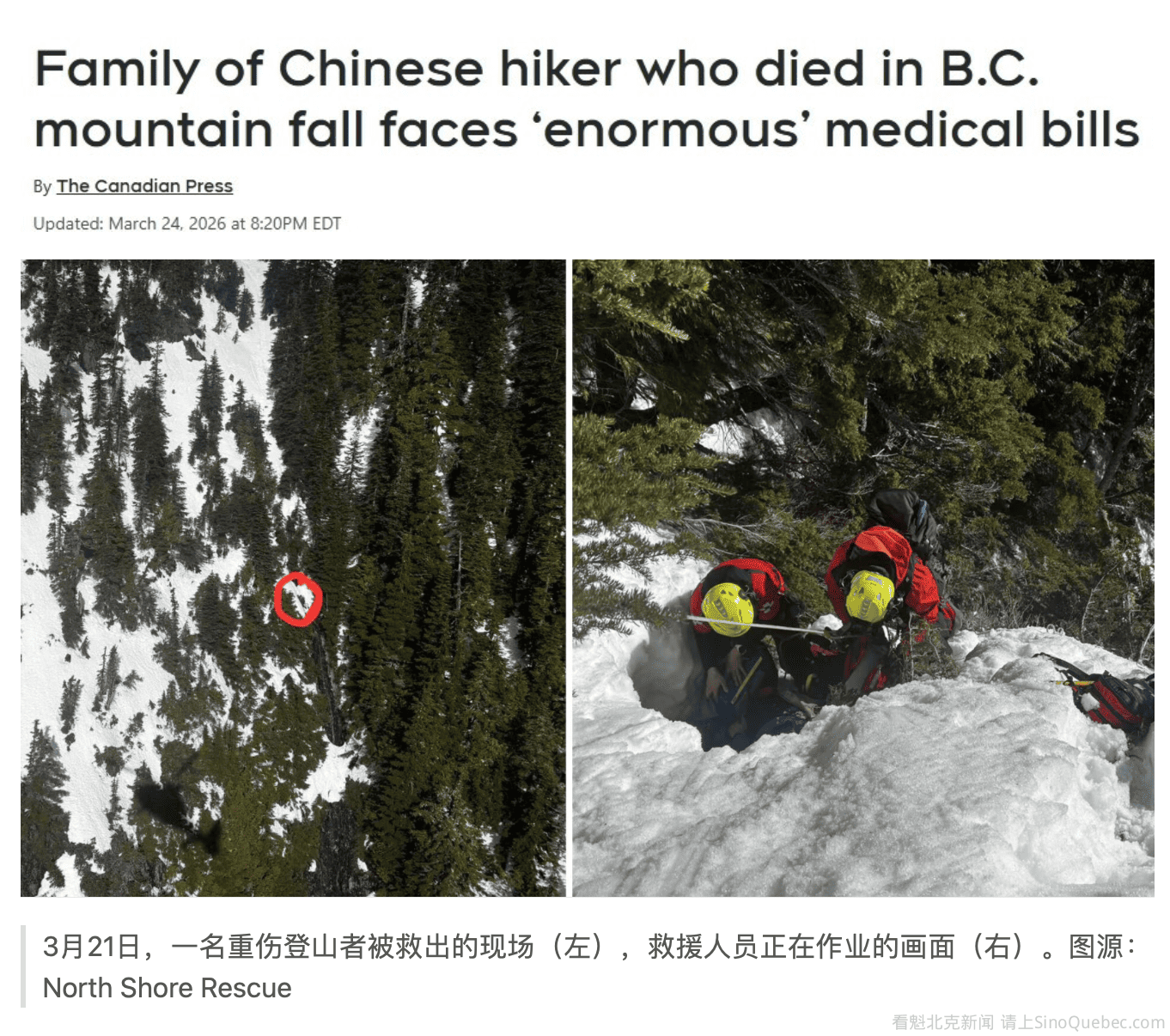 一场原本普通的登山活动,却酿成悲剧。 一名来自中国的男子在大温一座高山上为救同伴不幸坠亡,而他的家人如今不仅承受失去亲人的痛苦,还要面对高达数万元的医疗账单。 太平洋西北户外协会在一份在线声明中称,在卑诗省Lions Bay附近布伦瑞克山(Brunswick Mountain)约100米高处坠落的严岑(Yan Cen),“是在勇敢帮助另一名朋友时失去了生命”。 Lions Bay搜救队表示,这起事故发生在上周六,当时一支14人的登山队中,一名女子滑倒并坠落约20米。 随后,严试图下攀去协助她,但救援人员表示,他在陡峭且积雪的地形中也滑倒并继续坠落,最终停在一处瀑布上方。 Lions Bay搜救队的一名发言人证实,上周六被救出、并于次日不幸去世的男子,正是户外协会在线募捐页面中所提到的严。 募捐页面称,严的去世让家人悲痛欲绝,同时还要面对来自温哥华综合医院(Vancouver General Hospital)“难以承受的非居民ICU重症监护费用”。 温哥华沿岸卫生局(Vancouver Coastal Health)列出的数据显示,温哥华综合医院对非居民的重症监护费用为每天18,105加元。 “严岑是一位极其善良、充满热情的人,总是乐于帮助他人,”该协会在募捐页面中写道。 “他的突然离世让家人悲痛不已,同时也面临巨大且突如其来的经济负担。” 声明称,筹集的资金将用于医疗、葬礼及其他相关费用,截至周二下午已筹得约4.4万加元。 卑诗省验尸官服务处(BC Coroners Service)表示,目前仍在对该事件进行调查。 Lions Bay搜救队表示,周六的救援行动动用了绳索系统和两架直升机,“是一项复杂、困难且高风险的任务”。 该组织在社交媒体发文称:“这是一个极其悲惨的结果,我们向所有受影响的人表示慰问。” 救援团队表示,被救出的女性登山者情况稳定。 |