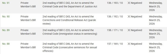 在3月25日周三的关键表决中,加拿大众议院连续否决了四项由保守党提出的私人议员法案,全部止步于二读阶段。 这四项法案均围绕加强刑事处罚和收紧治安政策,包括修改刑法、延长谋杀犯假释复审间隔、在量刑中纳入移民身份因素,以及对性犯罪实施连续刑期等内容,最终全部未获通过。 ![]() 图源:51记者拍摄 根据国会记录,当天被否决的四项法案包括: