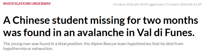 近日,一则跨越万里、牵动无数人心弦的中国博士生失踪案,最终以最令人心碎的方式画上了句号。 当地警方证实,此前在意大利失踪超过两个月的28岁中国博士生黄鹏(Peng Huang),已被确认不幸遇难。本周,其遗体在北部多洛米蒂山区海拔约2000米处被发现。 ![]() 图源:新京报 发现遗体的,是途经该区域的滑雪登山者。具体位置位于Geislergruppe、Mittagsscharte附近,介于Val Gardena/Gröden与Val di Funes/Villnöß之间。 接到报告后,意大利国家高山与洞穴救援队(CNSAS)迅速展开行动,联合高山救援直升机,在地形复杂、坡度陡峭的雪山区域完成了遗体转运工作。。 ![]() ![]() 图源:Bergrettung Villnöß 在意大利交流期间发生意外 据了解,黄鹏是一名博士生,自2025年8月起在意大利图西亚大学(University of Tuscia)进行交流学习。 2026年1月20日,他从位于Ortisei/St. Ulrich的住宿地出发,独自前往多洛米蒂山区徒步,随后未按计划返回。 出发前,他还通过微信与家人联系。然而当晚,他并未按计划返回。酒店业主随即报警,搜救行动正式启动。 此后数周,警方和救援人员在事发区域及周边展开大规模搜索,但始终未能发现其踪迹。 ![]() 图源:新京报 家人回忆:那次出行只是想“找灵感” 1月30日,即黄鹏失联11天后,他的姐姐曾在接受采访时透露,弟弟此前因论文投稿不顺,于1月19日独自前往多洛米蒂,希望在自然中寻找灵感。 在得知弟弟失联后,她和丈夫立即加急办理签证,从中国赶赴意大利寻找。由于语言不通,四川大学安排了一位老师同行协助,并在当地华人社区的帮助下展开搜寻。 但在长时间无果后,他们不得不带着遗憾离开。 ![]() ![]() 图源:新京报 最终等来的,是最不愿听到的消息 没想到,这场等待的终点竟是噩耗。 姐姐透露,家里经济特别困难,父母是工地上搬砖的工人。黄鹏深知父母的不易,从大学开始一直靠助学贷款完成学业。全家人都在盼着他毕业,能减轻一下家里的负担。 她哽咽着说,家里根本不敢把消息告诉爷爷奶奶,“他们90岁了,绝对承受不了......” ![]() ![]() ![]() ![]() ![]() ![]() 图源:新京报 初步判断为遭遇雪崩 根据目前调查情况,相关部门初步判断,黄鹏在登山过程中可能遭遇雪崩并被掩埋。由于当时山区积雪较厚,遗体未能及时被发现。随着近期气温回升、积雪逐渐融化,其遗体才在本周被发现。 有关部门表示,事件具体原因仍有待进一步确认。 ![]() ![]() ![]() 图源:Bergrettung Villnöß 这起事件再次引发对高山户外活动安全的关注。相关机构提醒,冬季及高海拔地区存在较高的自然风险,建议游客在进行登山或徒步活动前充分评估天气及地形条件,并尽量避免单独行动。 愿这样的悲剧,不再发生。 |