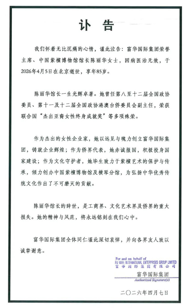 2026年4月7日,富华国际集团发布讣告:富华国际集团荣誉主席、中国紫檀博物馆馆长陈丽华女士,因病医治无效,于2026年4月5日在北京逝世,享年85岁。 ![]() 这位从贫寒家境走出、高中辍学谋生的女性,凭借过人胆识与杀伐决断,在北京核心商圈写下商业传奇,又因与“唐僧”扮演者迟重瑞的婚姻常年身处舆论中心。 一生聚财、守艺、持家,争议与荣光并行,如今大幕落下,一个时代的商界传奇就此谢幕。 01 从裁缝女工到地产女王 1941年4月,陈丽华出生于北京,幼时家境贫寒,高中便被迫辍学。 之后,她进入街道裁缝厂当工人,习得手艺后独自开店营生。缝纫之余,她常修补家中留存的紫檀老家具,这份兴趣为她日后的事业埋下伏笔。 1977年,在邻居建议下,她开办家具修理厂,正式开启创业之路。 关于陈丽华的第一桶金,坊间流传两种说法。 一种是 1981年初,她赴香港依托人脉涉足房地产,1988年创立富华国际集团,在比华利购置12栋别墅,通过低买高卖快速积累财富。 ![]() 陈丽华 另一种是80年代中期,她得知北京龙顺城中式家具厂存有大量“无主”明清紫檀、金丝楠等名贵家具,以低价购得部分,完成原始资本积累。 1988年夏,借着北京招商引资的东风,陈丽华以港商身份返京,几乎倾尽所有筹建长安大厦,同时在澳大利亚、东南亚等地布局地产业务。 90年代初,她拿下临近天安门广场的核心地块,投资8亿元打造长安大厦,其中顶层六层为北京首家五星级私人会所 —— 长安俱乐部。 项目因毗邻紫禁城、恰逢北京亚运会,审批历经波折,1994年方才动工。建成后,美方管理公司对装修方案不满,她果断拆除重修,1996年长安俱乐部正式开业,汇聚众多华人富豪担任名誉理事,成为彼时财富与地位的象征。 此后,陈丽华在王府井周边持续布局,兴建丽苑公寓、利山大厦等项目。1998年,她拿下金宝街改造项目,秉持 “钱吃亏,不能人吃亏” 的原则,28 天完成2100户居民拆迁,创下地产界纪录。 随后,金宝街陆续建成丽晶酒店、香港马会会所、金宝汇购物中心等高端业态,汇聚众多国际奢侈品品牌,成为北京知名高端商业集聚区。 除此之外,陈丽华还投资逾2亿打造了中国首家“国字号”私人博物馆——中国紫檀博物馆,有“中国紫檀女王”之美誉。 据陈丽华手上的富华国际集团(下称“富华”)官网介绍,富华1988年在香港成立,是一家多元化实业投资企业,支柱产业涵盖房地产、资产运营管理、文化艺术、金融等领域。集团项目遍及北京、天津、安徽、珠海、三亚、墨尔本等地。其中,富华在北京已建成使用和在建的经营性地产投资项目面积超过150万平方米。 数十年深耕京城核心商圈,陈丽华的商业版图与财富体量,也在资本市场得到直观印证。 2016年,胡润研究院发布《2016胡润女富豪榜》,北京地产女王、75岁的陈丽华以505亿财富首次成为中国女首富。 2026年3月5日,胡润研究院发布《2026 胡润全球富豪榜》,陈丽华以470亿元人民币身家,位列全球第656位。 02 情定 唐僧”,一段始终被舆论审视的婚姻 1986年版《西游记》热播后,陈丽华对这部经典作品情有独钟。 身为京剧迷的她,一次在中国京剧院唱戏会客时,偶遇唐僧扮演者迟重瑞,二人相谈投机,交往近两年。 陈丽华比迟重瑞年长11岁,她曾自述以“倒追”开启这段关系,欣赏迟重瑞俊朗外形与温润气质。 确定关系前,她征询三名子女意见,获家人支持后进一步交往。 迟重瑞初期心存顾虑,既源于11岁的年龄差距,也因外界“傍大款”的流言。 ![]() 陈丽华和丈夫迟重瑞合照 面对争议,陈丽华选择以婚姻回应。 1990年,49岁的陈丽华与38岁的迟重瑞在香港登记结婚。 婚后,迟重瑞淡出影视圈,全身心投入紫檀事业,担任中国紫檀博物馆副馆长。 二人相处恪守传统礼仪,平日互称“董事长”“迟先生”,交流多用敬称“您”,鲜少随意玩笑。 而迟重瑞的生活以陈丽华为核心,外出时贴身照料,挪椅端茶细致周到。 陈丽华曾坦言,与“迟先生”感情甚笃,从未红过脸。 迟重瑞则在采访中平和表示:“董事长是一家之主,得给足面子。她脾气火爆,只要发脾气,我从不吭声。等她脾气过了,会对我更好。” 在《鲁豫有约一日行》中,陈丽华谈及自己生活极简:不吸烟、不饮酒、不喝咖啡,只爱吃雪里红焖饭,每日生活费不过10元,毕生痴迷唯有紫檀艺术。镜头前,迟重瑞垂立一旁,温柔递上热茶。 这段婚姻自始至终伴随争议,“迟重瑞图财、陈丽华图名”的议论从未平息。面对质疑,迟重瑞多次回应:二人关系无需刻意表白,时间会给出答案。 如今,陈丽华以85年人生,走出了一条充满争议却无可复制的道路。 她在改革开放浪潮中抓住时代机遇,以强悍手腕构筑起横跨地产、文化的商业版图;有人赞她白手起家的商业魄力,有人议她打破常规的婚姻选择,也有人铭记她倾半生心血守护传承传统工艺。 是非功过,留待世人评说;传奇人生,终随岁月落幕。 |