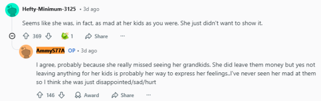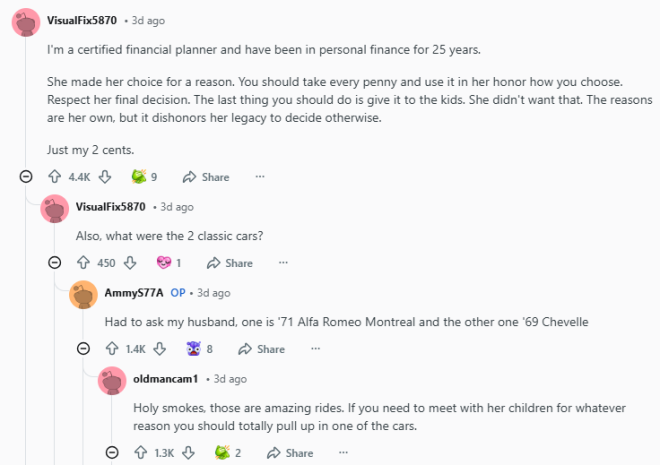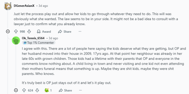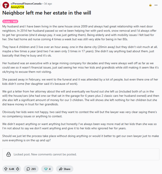 子女不尽孝,那就别想分遗产——这个道理在加拿大也一样。近日,在加拿大个人理财社区中,一则关于巨额遗产继承的帖子引发了公众对“养老与继承权”的深度讨论。 加拿大一名女网友在Reddit论坛分享了她最近经历的一场意外:相处十余年的邻居老妇人在去世后,竟将整套房产、多辆豪车以及大笔现金留给了他们夫妇,而其亲生子女则分文未得。 ![]() 图源:Reddit 十年邻里情:照顾与陪伴据发帖人描述,她与丈夫自2009年起便居住在老人隔壁,双方关系一直非常融洽。2014年老人的丈夫去世后,这对邻居夫妇便主动承担起照顾老人的责任,包括修剪草坪、清理积雪以及代购生活用品。 尽管老人雇有每周登门四次的居家护士,且年届八旬仍能自理,但在发帖人看来,老人的晚年生活在精神上颇为孤独。 ![]() 示意图 图源:Gemini生成 子女疏于探望:忙碌成了借口帖子写道,老妇人育有四名子女,其中三人住在车程一小时以外的地方,一人住在同城(仅20分钟车程)。然而,这些子女极少探望母亲,有的甚至在17年间仅露面3次。每逢佳节或日常,老人虽难掩对子孙的思念,却总为子女寻找“工作忙”的借口。 今年2月老人离世,葬礼上甚至有一名子女因工作原因缺席。遗嘱曝光:邻居继承房产,子女被“除名”老人的丈夫生前曾是大型矿业公司的高管,家底丰厚。 根据遗嘱执行律师的通知,老人将其居住的房屋、三辆汽车(包括两辆珍贵的古典老爷车,一台是1971年的阿尔法罗密欧-蒙特利尔,另一台是1969年的雪佛兰-沙威勒)全部留给了这对邻居夫妇。 ![]() 图源:Wikipedia 此外,她还为邻居的三个孩子预留了巨额资金,并为自己的亲孙辈设立了信托基金。最令人震惊的是,遗嘱明确标注:老人的四名亲生子女不继承任何遗产。 ![]() 示意图 图源:Gemini生成 法律博弈:子女拟起诉,邻居拒让步结果,老人的子女对这份遗嘱表示强烈不满,其中两人已声称将提起诉讼,挑战遗嘱的合法性。但遗嘱律师表示,老人在立遗嘱时精神状态完全正常,不具备撤销遗嘱的法定理由。 发帖人表示,他们从未觊觎过老人的财产,但目睹了多年来子女对老人的冷漠,她不愿将这份遗愿拱手让给那些曾忽视老人的继承人。 ![]() 图源:Reddit 目前,发帖人正寻求专业建议,以决定是否需要聘请私人律师来应对即将到来的法律纠纷。 Reddit高赞评论“我有25年的从业经验。她做出这个决定一定是有原因的。你应该接受每一分钱,并按照你选择的方式,以她的名义去使用它。请尊重她的最终决定。你最不该做的事情就是把钱还给那些(被排除在外的)孩子。” ![]() 图源:Reddit “法律程序该怎么走就怎么走,让她的孩子们去折腾吧。这份遗嘱显然就是她想要的,法律是站在你这一边的。不过,建议你自己也找个律师,以确认你已经掌握的信息。” ![]() 图源:Reddit “挑战遗嘱需要证明她当时精神失常或受到胁迫。从你的描述看,这两点都不成立。她把钱留给你们和孙辈,而不是给自己的成年子女,这本身就说明了她对这段关系的态度。” “虽然在某些省份(如BC省),法院可能会根据‘未提供充足生活保障’为由修改遗嘱,但如果你在安大略省或其他地方,遗嘱自由原则通常非常强大。不要因为觉得不好意思就放弃,那是她对你们多年邻里情谊的认可。” “如果孩子们要打官司,别害羞,大胆站出来!如果需要证人证明孩子们平时根本不在身边,而你和丈夫一直在照顾她,那就去作证。这是她的心愿,也是她对不孝子女最后的‘回击’。” “这太棒了。这位老太太显然很清楚自己在做什么。她把钱留给了那些真正关心她的人(你们)以及她依然爱着的后代(孙辈),唯独跳过了中间那些不尽孝道的子女。这是她对自己人生最后的掌控。” “请不要感到愧疚。你们在那10年里给老人提供的帮助和陪伴,其价值远超这些物质财富。对很多老人来说,能有可靠的邻居随叫随到,是他们能独立居住在家的唯一原因。这是你们应得的善报。” |