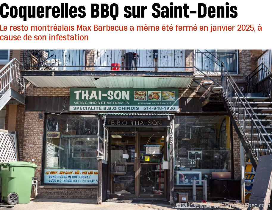 蒙特利尔 Saint-Denis 街的餐厅 Max Barbecue(也以 Thai-Son 名义经营) 因严重不卫生以及鼠患和蟑螂滋生,在2024年被迫关闭10天。 2025年1月27日,市检查员到访时发现情况极其恶劣:蟑螂在收银机上爬行,甚至被压死在设备表面;洗碗机内有蟑螂粪便;食品准备区也有大量蟑螂活动。同时,餐厅多个区域发现鼠粪,厨房和地下室还有死老鼠。 餐厅几乎所有设备和区域(如冰箱、炉具、墙壁等)都存在严重不洁问题,因此被勒令关闭8天。 2月4日复查时,蟑螂问题仍未解决,关闭时间再延长2天。直到2月6日,虽然卫生状况仍差,但虫害基本控制,餐厅得以重开。 然而问题很快复发:2月27日再次检查后,被罚3500元(虫害)和1300元(卫生问题)。此后又分别在4月和7月因类似问题被罚2000元和1700元。 这些罚款由法官于今年1月裁定。报告中甚至写明:“洗碗机框架内存在蟑螂粪便。”