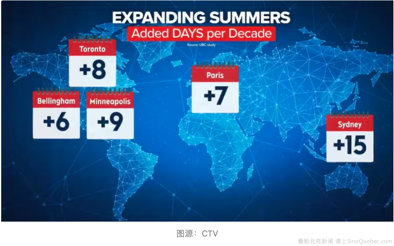 UBC 最新研究发现,夏季不仅越来越热,而且时间也变得更长,且变化速度比以往更快。加拿大及全球多地夏天提前来临且持续时间更长,部分地区近 30 年夏季延长达 50 天,气候变暖速度超预期。 在全球部分地区,研究发现过去 30 年中,夏季气温延长了多达 50 天。自 1990 年代以来,这一变化的速度也在加快。 该研究的合著者、UBC 地理系博士生 Ted Scott 表示,这项研究最初只是基于一种直觉。 Scott 说,“我只是觉得现在的夏天和小时候不一样了,这是我的感受。我们能不能看下数据,验证一下?” Scott 和团队分析了 1990 年至 2023 年的气温数据,统计每年达到典型夏季高温天数。 他们以每年最热三个月的历史气温为标准定义“夏天”,而不是按日历计算。 Scott 的直觉得到了证实。 他说,“我们知道夏天越来越热,但现在夏天还提前开始,也更晚结束”。 研究发现,世界各地从热带到极地之间的地区,夏季平均每十年延长约 6 天,高于此前研究报告的每十年 4 天左右。 在部分城市,这一变化更为明显。比如澳大利亚悉尼,夏季每十年延长约 15 天;多伦多则每十年延长约 8 天。位于温哥华以南的美国华盛顿州 Bellingham,夏季也以每十年约 6 天的速度变长。 该研究还发现,季节的过渡变得更加突然,春秋“肩季”缩短。现在,夏季高温往往突然到来,而不是逐步升温。 Scott 说,“这种变化可能会带来冲击”。 CTV News 本周在 UBC 校园采访的学生表示,气候变化已经成为大家关注的话题。 “我真的很担心,”Talha Zubir 说。Brooke Taylor 补充道:“如果我们现在不采取措施,看到这样的局面确实有点令人担忧。” 研究人员表示,现在正是适应新气候模式的时候,因为这将带来更多山火和更高的制冷用电需求。过早的高温也可能影响农作物种植时间,加快积雪融化,增加春季洪水风险。 |
