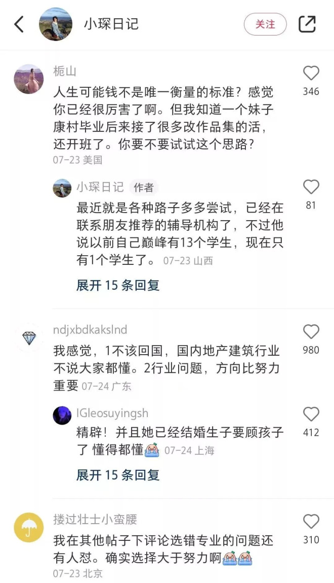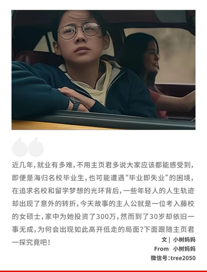 海归女硕士自曝尴尬现状:“我,藤校学霸、花光父母300万,如今30岁一事无成……” ![]() 这段时间,网上有一篇帖子引起了父母圈特别多的讨论。 一位名叫“小琛日记”的博主,发文讲了自己“藤校毕业后高开低走,到30岁一事无成”的经历。 ![]() 她在求学阶段的履历相当风光,甚至可以说是很多父母都期待的那种孩子。 16岁就在美国读高中,并且顺利考上了全美国排名前30的大学。 大学期间,每年都拿奖学金。平时把时间和精力都投入在学习上,甚至用3年的时间,就提前完成了原本需要4年的大学学业。 之后在美国读研深造,深入学习建筑。 从16岁出国到读研归来,整整8年。 不难想象一个女孩子孤身在国外,要取得这样的成绩,吃了多少苦,受了多少委屈。 而这8年的花销也是不菲。 她算很节俭的孩子,又拿奖学金,但几年下来,学费、住宿费、生活费、食宿等等林林总总加起来,折合人民币也花了大约268万左右。 ![]() 但是海外名校学成归来,正当25岁黄金年龄的小琛,找工作并没有想象中的顺利。 她的第一份工作,只有1万2人民币。 那时候她还对自己有信心,相信以后会升职加薪。 可是工作一年后,小琛怀孕了,带娃1年后重返职场,正赶上疫情爆发。 她的薪资停留在了1万2,并且至今未变。 海外求学花了将近270万,可是如今年薪却只有15万左右,即使不考虑通胀,也很难填平教育成本。 小琛用一事无成来形容自己,在她的帖子下面,也有无数留学生发了类似的感慨。 ![]() ![]() 在很多父母的印象里,考名校、出国留学,都是光宗耀祖的事情。 大家都觉得这些“见过大世面”的孩子,未来也一定有大发展。 可是在实际生活中,这种“高开低走”的例子并不少见。 不少孩子都曾有一手好牌、被给予厚望,但却走向平凡甚至平庸。 这些孩子不是所谓的“啃老族”,也不是一开始就想“躺平”,现实让他们心中颇有不平,周围人看着也不胜唏嘘。 他们的经历,也让人忍不住去思考:改变一个人人生轨迹的,究竟是什么? ![]() ![]() 在博主“小琛日记”的评论区里,很多网友都把她的几年没有涨薪归因于疫情、行业下行、过早的结婚生子等等。 综合来看,里面其实既有行业大形势,也有个人小选择。 娱乐圈里有句话:“小红靠捧,大红靠命”。 就像有些明星长得好,资源足,但观众缘就是不行,演了多少部女一号都让人记不住脸。也有些明星,长相平平,但一个角色就大红大紫。 其实对普通人也是一样,不过可以改成“小富靠努力,大富靠运气。” 在时代的大潮面前,站在风口上,猪都能起飞来。一个猛浪打下来,老鹰也可能难以站立。 ![]() 就拿博主小琛学的建筑专业来说,放在十几二十年前,是绝对的大热门专业。 那时候行业有句话,叫“三总五项”,意思是毕业之后去工地,三年就能当总工,五年就能干项目经理。 这个普通大学生毕业后 5 年,机灵点的孩子拿十几万甚至几十万的年薪不是梦。有海外留学经历,简直可以算金凤凰。 但是建筑行业之所以赚钱,是因为国家和资本一直在往里面投钱。 十几二十年前,小孩子的作文都会写“层层高楼拔地而起”。房价一直在涨,但大家还是追着买。 但如今掏空 6 个钱包,可能也只能买个紧凑小户型。这几年受疫情、生育率下降等原因影响,收入有所下降几乎是必然的。 而小琛又恰好在疫情之前因为生孩子耽误了一年多的工作,错过了最佳上升期,又是雪上加霜。 这几年我们常说,时代的一粒沙,落在普通人身上,就是一座山。 那些疫情前砸了全部身家投资奶茶店、餐饮店的商家;那些推掉其他offer签约进补习机构的老师;那些过了在大厂勤奋工作满35岁的程序员…… 他们可能非常勤奋、非常努力、非常优秀,什么都没做错,但突然有一天,发现自己成为了失业大军的一员。 我记得前央视著名主持人张泉灵在一次演讲上说: “这个时代变化太快了,你生活在这个时代,但你的内心的价值观可能还在上个年代,甚至上上个年代,如果跟不上社会变化,时代抛弃你的时候连招呼都不打。” 这个世界唯一不变的,就是变化。而一个人的人生,就是之前无数个选择的总和。 小学有没有考100分,初中有没有进重点名校,大学有没有拿奖学金,这些非常重要,但没有重要到会影响整个人生。 有没有持续做对的选择、有没有跟上时代、有没有及时止损、有没有在不确定中给自己留一些退路,这些才更重要。 ![]() 经常会有一些怀才不遇的孩子,感叹这个世界非常不公平,他明明那么努力,却输给了一些有背景、有资源的人。 不得不说这是一种无奈。但也确实要承认一个残酷的事实,很多时候,努力的方向不对,再多的辛苦都是瞎忙。 这个世界上有很多东西,就是比努力更重要。有时候十年寒窗的努力,就是比不上“比人家父母”的几句点播和帮助。 博主@清华小崔曾分享过他的经历,他来自5线小城一个普通家庭,17年通过努力,考上了清华。 在清华交的好朋友父母是一个大学的院长,在他眼里朋友是“官二代”。 起初俩人一起玩,一起聊物理、聊人生,觉得志同道合,很开心。 但是后来差距就体现了,朋友转系了,成绩越来越好,不仅去了伯克利大学交换,大学期间还发表了3篇顶级期刊论文,最后去了世界排名前四的一所大学读博。 而他在清华的整个4年,都过得平平淡淡。 用他的话说:也没做出什么特别的成绩。 这些差距,让他觉得非常难受。 小崔本身是个很聪明很努力的孩子