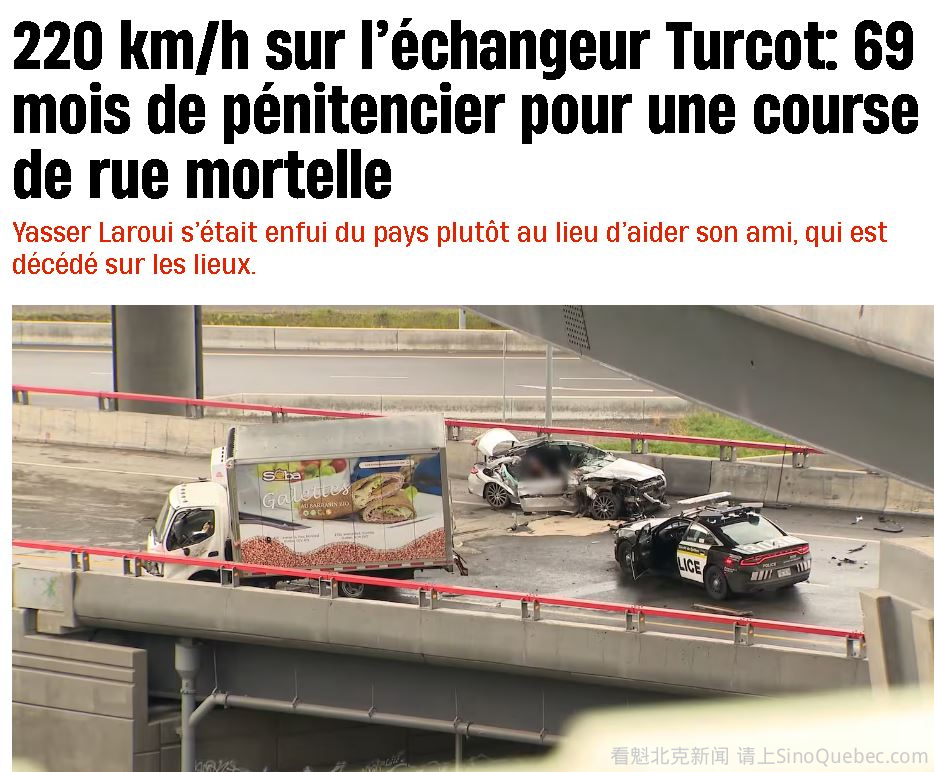 一名年轻男子在蒙特利尔Turcot立交桥以220 km/h参与街头飙车,被法官形容为“拿朋友的生命玩俄罗斯轮盘赌”。他在将受害者抛下后逃往阿尔及利亚。 法官Roxane Laporte今天周四在蒙特利尔法院表示,这样的判决是对所有道路使用者的警示:“这种行为即使发生在看似没有前科的人身上,也会受到严厉惩罚。” 22岁的Yasser Laroui来自Longueuil,被判69个月监禁(约5年9个月)。 2024年6月30日早上约6点,他驾驶一辆租来的灰色奔驰车,车上载有两名朋友,在Turcot立交桥上高速追逐另一辆奔驰车。 两车速度超过限速70 km/h的三倍以上。 法官指出,这种高速驾驶是“可预见严重后果的行为”,对公众造成巨大危险。 追逐过程中前方车辆在匝道弯道撞上混凝土护栏,Laroui紧随其后,撞上前方货车尾部。 19岁Jahmal Emilus Dorcelus当场死亡,另一名15岁乘客受轻伤(头部外伤及缝针)。 事故后,Laroui丢下受伤朋友,直接前往机场飞往阿尔及利亚。 尽管没有犯罪前科,Laroui当时驾照已被吊销,无权驾驶。此外,车辆牌照不符,车内还发现多种与盗车相关的工具。 Laroui于2024年8月返回加拿大,但三个月后才被警方逮捕,此后一直被羁押。 检方要求判处超过6年监禁,而Laroui则希望仅被判3年。 考虑到其已被羁押的时间,他仍需服刑约43个月。出狱后5年内不得驾驶。