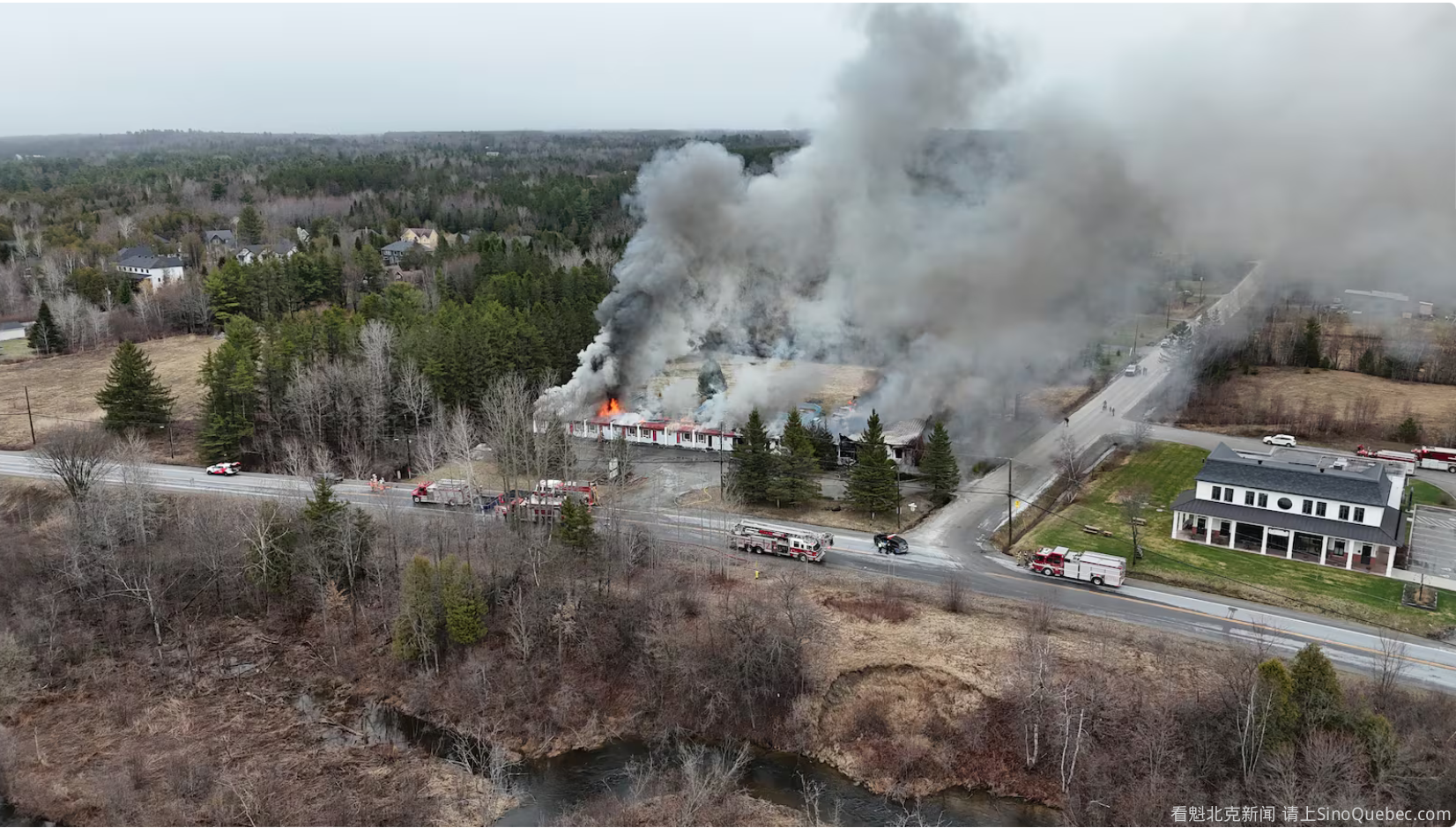 周五早晨,位于魁北克省 Eastern Townships、Mont Orford 以北的红色屋顶汽车旅馆被大火吞噬。 清晨 6:30,消防部门接到报警称 Motel de la Pente Douce 起火。该旅馆位于 Magog 的 Rivière-aux-Cerises 路,距离美加边境约 40 公里,当时现场浓烟滚滚,火光冲天。来自 Sherbrooke、Memphrémagog 及周边城镇的消防队悉数赶往支援,现场集结了超过 36 名消防员。 官方报告称,目前暂无人员伤亡。Magog 消防局局长 Daniel Comeau 向 Noovo Info 表示,火势没有蔓延的风险。 “我们赶到现场时,火势已经非常猛烈了,”Comeau 说道,“为了安全,我们没有派人进入内部,而是在建筑物外围进行灭火。”他补充说,由于该建筑房龄较老,火势顺着阁楼迅速蔓延。 目前,起火原因仍在调查中。 |