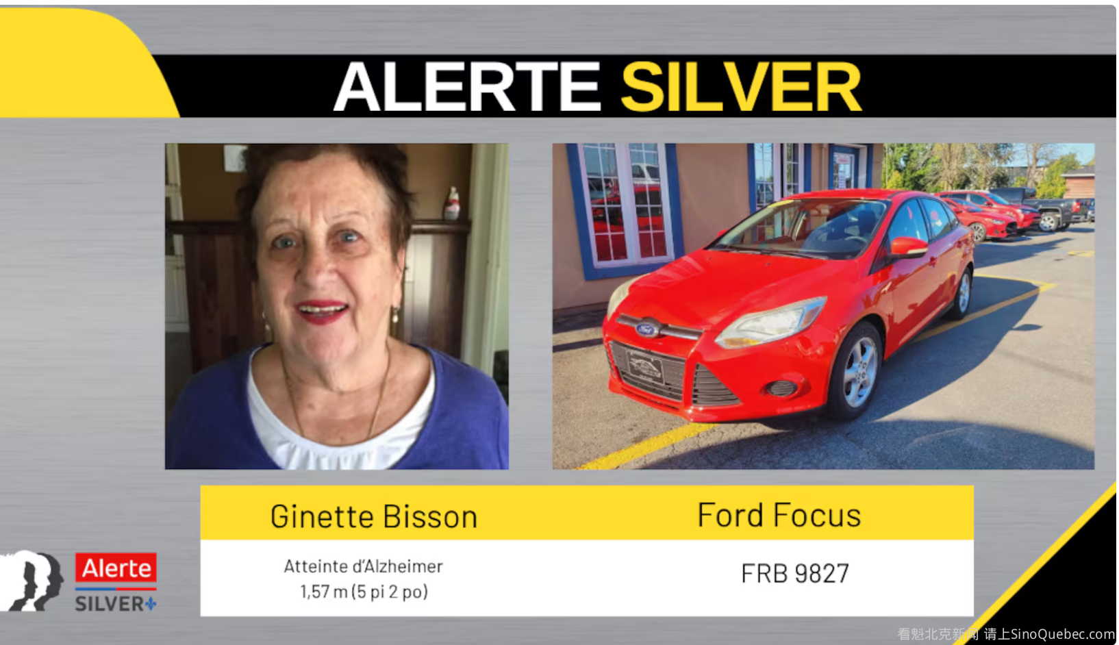 魁北克省警方正寻求公众协助,以寻找居住在 Salaberry-de-Valleyfield 的 79 岁老人 Ginette Bisson。 她最后一次露面是在该市的 Grosse-Île 地区。她的失踪触发了“银色警报”(Silver Alert)。 警方认为她可能正驾车前往安省方向,并表示她可能处于迷失方向的状态。Bisson 身高 5 英尺 2 英寸,体重 150 磅,留有灰色短发,长着棕绿色眼睛。 她驾驶的是一辆红色 2013 年款 Ford Focus,车牌号为 FRB 9827,车门上印有字母。她最后一次被发现时身穿深色外套和棕色靴子。 任何发现 Bisson 踪迹的人请拨打 911,也可以通过拨打 1-800-659-4264 联系魁省警方。 |