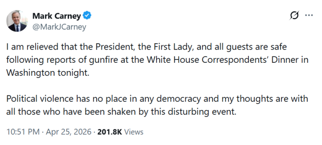 周六晚,美国总统特朗普在白宫记者协会年度晚宴上毫发无损,包括副总统在内的多位白宫高级官员在接到不明威胁后被迅速撤离。目前暂无人员伤亡报告,一名执法官员称有枪手开枪。加拿大总理卡尼在 X 上表示,得知美国总统、第一夫人和来宾平安无恙,他感到欣慰。 ![]() 当局表示,事件发生在特朗普和其他宾客就座的宴会厅外,具体情况尚不清楚。活动已被取消,日后将重新举行。 联邦调查局称,枪手已被拘留,华盛顿外勤办事处正对枪击事件进行响应。 特朗普通过 Truth Social 表示,今晚将在白宫发表声明。 记者们正在从目击者证词、官方消息和其他渠道拼凑事件细节,以全面还原枪击经过。 特勤局迅速护送总统及副总统离场事件发生后,包括全副武装的反突击队在内的特勤局特工快速上台。副总统 JD Vance 先被带离,特工随后掩护特朗普和第一夫人梅拉尼娅离开。 特朗普下台时一度踉跄,安保人员搀扶下脱离了现场。 总统最初在酒店总统套房内暂时安置,工作人员试图恢复活动,后因特勤局建议,被送回白宫。 监控录像显示嫌疑人奔向宴会厅监控录像显示,嫌疑人朝白宫记者晚宴方向奔跑。 ![]() 加拿大总理卡尼发声加拿大总理卡尼在 X 上表示,得知美国总统、第一夫人和来宾平安无恙,他感到欣慰。他强调,政治暴力不应在任何民主国家存在,并与受事件影响的人们同在。 ![]() 希尔顿酒店历史安全事件1981 年,时任总统里根曾在华盛顿希尔顿酒店外遇刺,该事件促使酒店加强安保,并在入口附近为各国领导人增设特殊总统套房。此次事件后,特朗普也曾短暂被安置在那里。 派对组织者调整安排电视台 MS NOW 通知宾客,仍可前往杜邦环岛参加地下派对,大家可以聚餐。该组织称,尽管今晚与原计划不同,但为朋友和同事提供聚会空间很重要,其记者团队已外出报道突发事件。 警方:动机尚不明确代理警察局长杰弗里·卡罗尔表示,目前无法确定枪手作案动机,还不能判断目标对象。 检察官:嫌疑人面临初步指控美国检察官珍妮·皮罗表示,嫌疑人初步被控非法持有枪支和使用危险武器袭警,更多指控将根据后续信息追加。嫌疑人预计将于周一在联邦地区法院出庭。 嫌疑人持多种武器华盛顿特区代理警察局长卡罗尔称,嫌疑人携带霰弹枪、手枪和多把刀具,并表示目前没有迹象显示有同伙涉案。 特朗普称赞特勤局并感叹总统职业危险特朗普在白宫对记者表示,总统是一项危险职业,针对他的暴力企图是"工作的一部分"。他称将公布更多有关枪手身份和动机的信息。 总统称赞特勤局表现,并表示枪手当时距离宴会厅还有相当距离,没有突破安全防线。他还提到在场记者盛装出席,"我看到这么多礼服和西装,今晚与大家预想的不太一样,但我们会再办一次。" 晚宴将重新安排特朗普强调,晚宴将会重新举行,并称活动会更加安全。 枪击嫌疑人身份公布执法部门向美联社透露,枪击嫌疑人为加州 Torrance 的 Cole Tomas Allen,现年 31 岁。 ![]() 特勤局长期研究晚宴安保多年来,美国特勤局一直将白宫记者晚宴作为安保演练的重要场合。 特朗普回忆枪响时刻特朗普回忆枪声响起时,自己一开始以为只是托盘掉落,声音"相当远"。但第一夫人很快意识到那是枪击,提醒他"那是个不妙的声音"。总统表示,枪手动机尚不清楚,但"他倒下时看起来很邪恶"。 特朗普呼吁加强安保特朗普在发布会开始时呼吁提升安保级别,称"现在我们需要前所未有的安全措施",并以此次事件作为白宫新建宴会厅必要性的例证。 枪手持多种武器袭警特朗普在白宫新闻发布会上称,嫌疑人在被特勤局制服前持有多种武器。一名警员中弹,但因防弹背心保护无恙。 "他被一把非常强力的枪近距离射击,但防弹衣起了作用。" 特朗普发布的监控显示,一名男子冲过金属探测器,执法人员拔枪追击,随后将其制服。 国会两党领袖回应众议院议长 Mike Johnson 表示,自己和妻子都在现场,对执法人员和急救人员的迅速反应表示感谢,并在社交媒体上为国家祈祷。众议院共和党账号呼吁团结祈祷。众议院民主党领袖 Hakeem Jeffries 也感谢警方保护所有人员,并呼吁结束暴力。 FBI:枪手已被拘留联邦调查局表示,枪手已被拘留,华盛顿办事处正响应事件。 一名警员中枪但无大碍华盛顿警方确认到场配合联邦执法华盛顿警察局在社交媒体上称,警方已到场并与联邦执法机构协作,确认后将及时发布最新信息。 ![]() 特朗普将就事件发表声明特朗普总统表示,将于晚 10 点后在白宫新闻发布厅召开记者会。他在 Truth Social 上补充,第一夫人、副总统及所有内阁成员均安全无恙。 记者协会主席发言CBS 资深白宫记者、记者协会主席 Weijia Jiang 向记者们表示,总统很快将在白宫举行新闻发布会,并坚持要在 30 天内重新举行晚宴。她称,自己当时就坐在特朗普身边,强调新闻从业者遇突发时应冲向现场而非逃离,并感谢大家团结一心。 枪击发生时宴会刚开始枪击发生时,宾客们正享用沙拉,服务员准备上主菜。此时安保人员冲进宴会厅,要求所有人趴下。记者们身着礼服躲在桌旁,红酒洒在桌布上,玻璃杯碰撞声四起。 武装安保冲上台,宾客们迅速避险,有人在现场高喊"USA!" ![]() 枪手被捕,副总统平安特朗普在 Truth Social 上称,枪手已被抓获,自己和副总统 JD Vance 均未受伤。 ![]() 多数宾客被困宴会厅组织者称将很快发布公告,绝大多数宾客被封锁在宴会