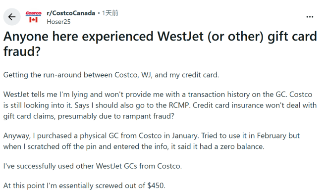 近日,一位加拿大网友在 Reddit 的 r/CostcoCanada 社区发帖,讲述自己在 Costco 购买 WestJet 礼卡却遭遇余额清零的经历。该网友表示,今年 1 月在 Costco 购入一张实体 WestJet 礼卡,2 月尝试使用时,发现卡内余额已为零,实际损失高达 $450 加元。 向 WestJet 求证时,对方既拒绝提供交易记录,又质疑其说法的真实性;Costco 方面则表示还在调查,并建议其向皇家骑警(RCMP)报案。信用卡公司则以不受理礼卡相关理赔为由,拒绝协助。 ![]() 社区热议:多方推诿,消费者权益难保障该网友补充,自己曾成功使用过 Costco 购买的其他 WestJet 礼卡,但此次维权屡屡受挫。多位网友对此表示共鸣,有人直言:"在这类问题上,只有 Costco 还有点服务意识,WestJet 基本不会帮忙。"还有网友建议,重点应继续与 Costco 沟通,甚至尝试写信或上门交涉,强调"他们卖出的问题商品,理应负责"。 ![]() 也有评论指出,WestJet 理论上应能查询礼卡的使用记录。有网友建议将 Costco 购物小票发给 WestJet,查证卡是否在购买前就被用掉。但发帖人反馈,WestJet 只承认卡曾被激活和使用,却拒绝透露更多交易细节,令维权陷入死胡同。 礼卡欺诈案例频现,网友支招应对讨论中,不少网友分享了自己或身边人遭遇礼卡欺诈的经历。有网友称自己购买过其他品牌礼卡也曾遇到余额被盗刷,维权同样艰难。有人建议,面对这种情况,应尽量通过信用卡拒付(chargeback)追回损失,尽管有信用卡公司明确拒绝处理礼卡相关争议。 另有网友提醒,部分礼卡本身为不可退款产品,且因诈骗案件频发,相关企业态度日趋强硬。也有网友建议,遇到类似问题可尝试联系 WestJet 母公司 Onex 或寻求警方协助,有时或能获得更多调查信息。 ![]() 华人消费者需警惕,买礼卡前后多留心有网友提到,Costco 工作人员透露,至少还接到过一起类似投诉,表明礼卡被盗刷并非个案。也有网友分享,自己曾收到某餐厅的礼卡,发现余额为零后,餐厅总部最终补发了新卡,算是较为顺利的维权案例。 ![]() 不少评论认为,礼卡诈骗屡见不鲜,尤其是大额礼卡更容易成为不法分子的目标。部分网友表示因此选择不再购买此类礼卡,提醒大家购买前务必保留好激活凭证和购物小票,遇到余额异常要尽快与销售方和发卡机构沟通,必要时可寻求法律途径维权。 |