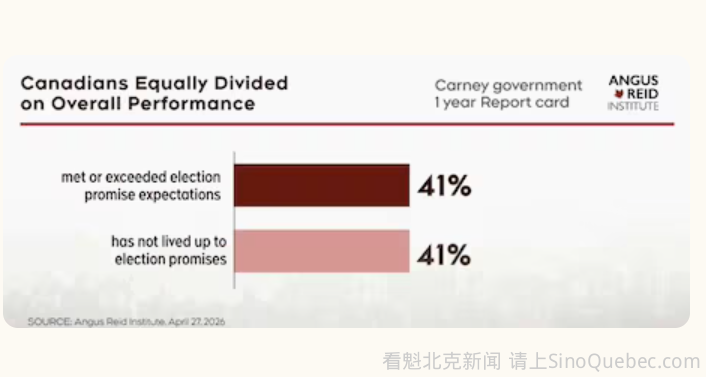 最新 Angus Reid 研究所民调显示,卡尼政府执政一年后,加拿大人对政府表现意见明显分化。41% 受访者认为政府至少达到了选举承诺标准,另有 41% 则认为未达预期。 住房、生活成本成最大短板 民调显示,住房可负担性和生活成本是当前卡尼政府最大的短板。超过三分之二的受访者表示,政府在改善住房可负担性和应对生活成本方面表现不佳。"加拿大人在可负担性问题上显然期待更多。"Angus Reid 研究所指出。 而在未来一年,降低生活成本被半数以上受访者视为政府面临的最大挑战。尤其是在伊朗战争导致油价上涨的背景下,这一民生压力尤为突出。 外交、国防表现获认可 尽管民生压力突出,卡尼政府在国际事务和国防领域获得不少认可。64% 受访者认为,政府提升了加拿大的国际声誉。在管理与美国及特朗普总统复杂关系、应对贸易战和即将到来的贸易协定重新谈判方面,多数人给予卡尼正面评价,只有 37% 认为外交仍有进步空间。 在国防方面,60% 受访者认可政府将国防开支提升至 GDP 2%,首次达到北约要求。加拿大下一个目标是在 2035 年前实现国防开支占 GDP 5%。 支持率高于部分前任,党派分歧加剧 整体来看,58% 加拿大人认可卡尼政府迄今工作成绩。 自由党支持者普遍满意,但保守党支持者中有四分之三认为国家方向错误。党派分歧也体现在对政府腐败问题的感知上,保守党选民更关注选举后"跳槽议员"现象。保守党反对党领袖博励治就曾评论这些是"肮脏的幕后交易",三分之二的保守党选民认为"跳槽议员"应该辞职并通过补选重新确认议席。 卡尼的执政一年支持率,超过 Stephen Harper、Paul Martin、Brian Mulroney 和 Pierre Elliott Trudeau 等前任,但逊于 Jean Chrétien 和贾斯汀·特鲁多。 就业、腐败担忧上升,其他议题变动不大 受访者还关注青年失业问题,虽然总体失业率低于去年同期,但 24 岁以下青年失业率接近全国均值两倍。部分青年表示,投出数百份简历却鲜有回应。 腐败问题的关注度也较去年上升,主要由保守党选民推动,与选后议员"跳槽"现象相关。 相比之下,医疗、经济、犯罪、移民、税收、应急准备、贫困和原住民和解等议题关注度与去年变化不大。 民调方法说明 本次民调由 Angus Reid 研究所于 4 月 15 日至 20 日在全国范围内,针对 2,013 名成年人进行网络抽样调查,样本覆盖 343 个联邦选区,按人口普查数据加权,误差范围为正负 2 个百分点(19 次中有 20 次准确)。