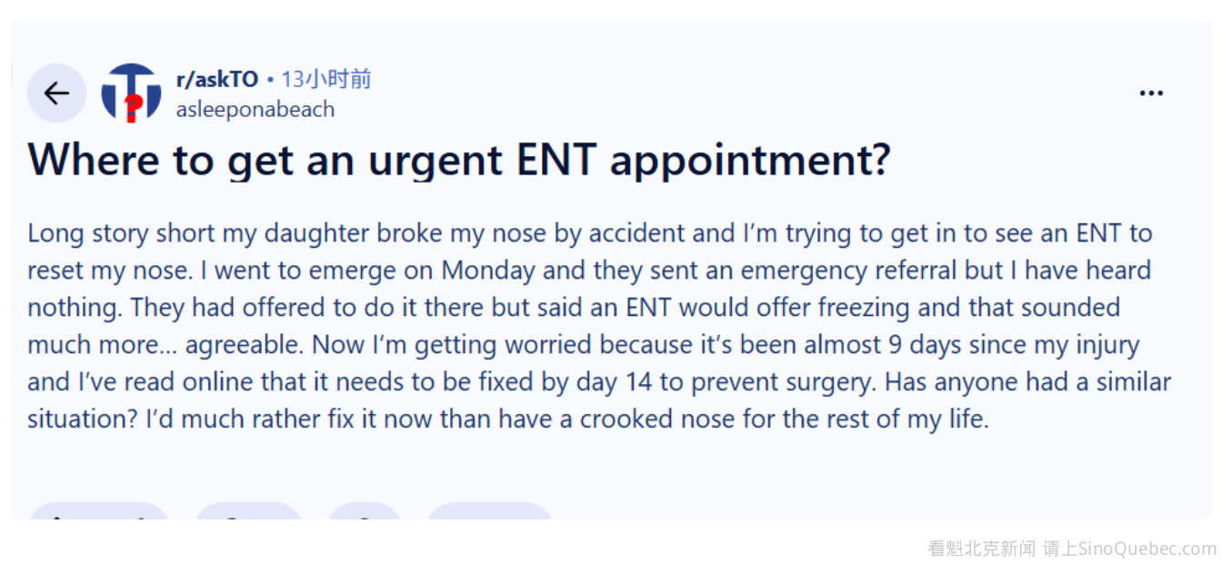 多伦多一位网友因意外导致鼻骨骨折,急需挂号耳鼻喉(ENT)专科,预约困难、等待时间长。该网友在 Reddit r/askTO 社区发帖求助,短时间内收获大量本地居民的经验分享,集中反映了目前多伦多专科就诊的真实状况。 急诊与专科挂号窗口有限 不少网友指出,鼻骨复位的最佳时间一般为受伤后 5-14 天。超过这一窗口,骨骼和软骨会开始愈合,后续可能需要更复杂的手术。 部分网友提醒,受伤 48 小时后软骨会逐渐变硬,紧急处理尤为重要。 有经验者建议,如急诊医生不愿意现场处理,不妨到其他医院急诊再试。部分急诊可在无麻醉的情况下直接复位,手续相对快捷。有网友表示自己在急诊 7 天后复位,过程并不疼痛,"只需金属棒复位,吃点 Advil 即可"。 推荐医院与专科医生 Michael Garron Hospital:多位网友提到该院 ENT 专科响应较快。有人表示拿到转诊后,主动打电话、催促,在跟进的情况下次日即获预约。也有人反馈初诊等候时间可能长达数月,因此建议亲自跟进进度。 Scarborough Health Network(士嘉堡健康网络):有网友推荐 3030 Lawrence Ave 的 Praby Singh 或 Lily Wang,急诊患者通过院内门诊可能更快安排,建议提前电话联系(416-673-9393)。 专科诊所/快速通道:Rapid Access to Medical Specialists 的 ENT 门诊被推荐用于加速预约。 其他急诊/门诊:部分网友列举了多伦多及周边可提供当日急诊或加速转诊的诊所,包括 Albany Medical Clinic、Bay College Clinic、Kindercare After-Hours Urgent Care、New Jane Medical Clinic、Scarborough Health Network Centenary Site、Thrive Kids Walk-in Clinic,以及 Head & Neck Clinic(491 Eglinton Ave W)。 实用建议:如何缩短等待 主动联系专科:拿到转诊后,务必主动致电 ENT 医生或诊所,确认转诊单是否收到,并持续跟进。"打电话、发邮件、反复催促,越'吵'越容易被优先安排。" 多尝试不同医院急诊:如一地急诊医生不愿意处理,不妨换家医院再试。 利用快速通道/门诊:部分诊所和专科设有"快速预约"通道,适合急需处理的患者。 留意时间窗口:如错过最佳复位期,后续可能需付费做整形手术,务必提早行动。 协调家庭医生:转诊大多仍需家庭医生配合,记得同步联系。 多位网友反映,近年多伦多 ENT 专科医生紧缺,预约普遍需等数周到数月,部分非急症甚至一年难约。即便 MRI 和手术有时能加速,但整体资源有限。原帖发起者也表示,自己和家人曾为其他专科问题等了一年。 特殊情况与其他选择 部分网友建议,若经济条件允许,也可考虑前往美国自费就诊,但大部分人更倾向于在本地坚持追踪。 对急需耳鼻喉专科就诊的患者来说,多伦多地区的关键是主动出击、多渠道尝试。充分利用推荐的医院与诊所资源,才能在有限的时间窗口内获得及时治疗。 |