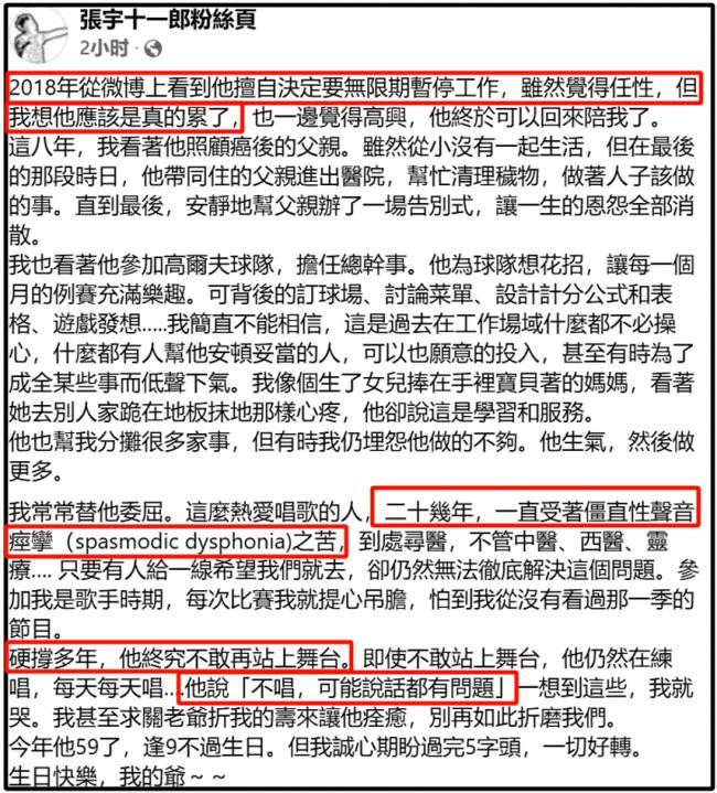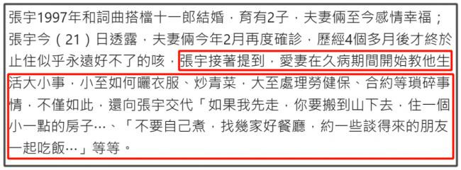在张宇59岁生日这天,张宇的妻子十一郎发文为他庆生,并随之透露了他停工8年的原因,直言宁愿自己折寿也希望他能痊愈。 原来张宇身患罕见病,20多年来一直到处求医,但始终无法彻底治愈这个问题。早年张宇受邀参加《歌手》录制,十一郎全程不敢看节目,害怕张宇出现问题。 此后几年,张宇硬撑着也参加了不少节目,开演唱会,但在2018年,张宇没提前商量,擅自决定要无限期暂停工作。后来也传出张宇要复出的消息,台媒还爆料称张宇为了复出改变唱歌方式。但后来张宇只是去音综当了评委。 最近几年张宇也有被网友偶遇,也曾在好友袁惟仁去世时露面,没有刻意躲避媒体和镜头,但却始终没说何时返回歌坛,开自己的演唱会。 终于在26年4月份的时候,张宇重新站上舞台,为好友游鸿明的演唱会担任嘉宾。张宇自己心态倒是很稳,离开舞台8年,虽然有紧张,但依旧是老样子,出来就自曝糗事,说自己的耳机因为8年没有用过,都脱落了,还是后台工作人员紧急给他换了一副。 甚至还提起之前因为一起参加《歌手》而结缘的邓紫棋,张宇还戏称邓紫棋为“儿媳妇”,抱怨游鸿明的演唱会和邓紫棋撞档期,“害我没办法去大巨蛋听我儿媳妇唱歌”。当晚老友齐聚游鸿明演唱会,张宇还怀念了小胖袁惟仁,感慨独缺他一人。 ![]() ![]() ![]() ![]() ![]() 当晚,59岁的张宇连唱3首歌,包括《雨一直下》、《用心良苦》等经典曲目,唱功一如既往,就是嗓子状态不好,听出来明显的沙哑,唱歌吃力。如果不是十一郎透露张宇身患罕见病,网友还以为他只是上了年纪,机能衰退。 ![]() 十一郎透露张宇虽然停工8年,但一直有坚持每天都练歌,他害怕自己不唱歌,未来可能说话都成问题,看来张宇的病情发展不容乐观。十一郎称每次想到这些都会想哭,宁愿自己折寿来换张宇痊愈,也不希望他受此折磨。 ![]() 张宇退圈后逐渐失去“光环”,在别的领域活动也学会了“低声下气”,这让妻子感到心痛。 说起张宇和十一郎这对夫妻,两人的感情其实一直很好,但不知道为什么网传张宇出轨一次,十一郎就会写一首歌内涵他,逼得十一郎当年发文怒怼辟谣,更是直言“人还活着都能被写成这样,将来死了还得了?” ![]() 从十一郎的发文就能看出她对张宇的深爱,25年的时候,十一郎生病,觉得自己状态不好,开始教张宇处理生活琐事,从如何晒衣服到如何做饭,再到处理保险、合约。 ![]() 光是看这些东西,就知道张宇在过去的几十年,都是被妻子全方位照顾的,以至于妻子害怕自己走了之后,张宇无法自己生活。 ![]() 好在如今张宇和妻子的状态都还好,张宇还过了59岁的生日,就祝愿张宇能够早日摆脱病魔困扰,和妻子安稳相伴到老吧! |