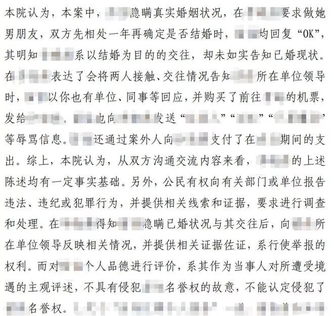 通过婚恋网站,王女士(化姓)认识了自称未婚的上市公司原高管张某(化姓)。然而,在发生关系后,她发现张某早已结婚。王女士向张某所在公司举报,后公司与张某解聘。双方在公开社交平台、私下交流中都曾受到攻击,均向对方提起民事诉讼。 一份终审判决书认定,王女士举报内容不涉及名誉权、隐私权侵权,但公开发言中的一句被认定具有人格侮辱性质的言辞让她被判赔1000元。另一份因上诉而未生效的一审判决书认定,张某的行为侵犯了王女士的身体权及人格尊严,被判赔偿5000元。 ![]() 张某曾报案称王女士找人代发短信,干扰其正常生活,她因此被行政拘留5日。 对于双方纠纷具体情况等,记者曾多次致电、发短信询问张某,张某表示王女士的说法不实,但不愿意接受采访。 三年来,围绕此事已发生两起民事诉讼、一次行政处罚,情感纠纷的法律边界在哪? 交友时称未婚、事后发现已婚 女方一年后举报,公司调查后解聘 王女士与张某在婚恋网站相识。据生效判决书,2023年3月18日,张某曾说“虽然挺想和你认识,但是异地恋挺辛苦的”“可以加个微信”。微信上,双方相互询问婚姻状况,均表示自己“未婚”。 2023年“五一”假期,张某来到了王女士所在的城市,双方同住四天。但在张某离开次日,两人关系迅速变化。据生效判决书,2023年5月4日,张某曾不回消息、拒接电话,称“超忙”“你为什么这么逼迫”等。在多次追问中,张某曾拉黑王女士。接下来数日中,王女士发消息控诉张某的行为,提及会联系张某公司等,张某言辞激烈地回复了她,亦称“XX企业里,怎么会出现你这么一个XXX的人”“用你所有的生活圈子当赌注,做一些没有意义的事情”等。 ![]() ▲双方短信往来 图据王女士 王女士回忆,2023年5月23日,出于对身体情况的担忧,她曾找人跑腿去张某公司送信,却得知张某已婚。聊天记录显示,跑腿的人称了解到有自称张某老婆的人来过,建议王女士向警方报案,王女士称“报警了已经”。据生效判决书,同日,王女士给张某发短信“你原来已婚了”。 在后来的庭审中,张某曾辩称,基于交友目的,他在婚恋网站上提供了自己的联系方式,当时由于夫妻感情不和处于分居状态、已经着手处理离婚事宜,而在双方见面后,他告知自身的婚姻情况,认为双方不合适,主动疏远关系。 2023年6月,王女士向张某公司管理人员反映情况,后张某向王女士返还同居支出一千元。平静近一年后,王女士正式向张某公司举报,“他骗我说他有外债,我就怕他丢掉工作。到了2024年5月,我突然发现他是某个年度人物,年薪原来有一百多万,我就想他也配。” 据生效判决书,公司管理人员就王女士举报内容开展了调查。公开资料显示,2024年9月,因张某个人原因,公司同意解聘张某职务。 因“发短信干扰对方生活” 被行拘5日 2024年,从公司管理人员开展调查到解聘之间的4个月,王女士尝试了不同方式“要求张某道歉”。 据生效判决书,就张某的情况,王女士多次写邮件,同时发送给张某、抄送给张某所在公司管理人员。 王女士称,张某拉黑了自己,她开始找人向他代发短信“要求道歉”。据生效判决书,这些短信内容包括要将张某的情况发布在微博上、准备在张某公司抖音和公众号进行评论、准备带着张某贴身衣物去张某公司等。她称自己总共找人代发了二十余条短信,“张某不断辱骂恐吓我。” 对于“辱骂恐吓”情况,除了2023年双方往来外,王女士称,2024年6月开始,张某在社交平台不断晒出与女性共处的照片等,“天天(配文)‘甜甜的’”,“目的是刺激我。”她出具的截图显示,在相关照片下方,有其他用户评论了疑似对王女士的辱骂内容。另有截图显示,疑似该评论用户还向王女士私聊了多条辱骂性质消息。相关截图均未显示具体发生日期。2026年4月,记者未能检索到相关视频及评论,亦无法确认视频账号、评论账号具体身份。 生效判决书显示,张某发布过与女性碰杯图片的视频,配乐“甜甜的”。王女士找人代发的短信中,曾提及“秀恩爱,慢慢秀”“别停!甜甜的!”等。 2024年10月,王女士被行政拘留5日。由西湖公安作出的行政处罚决定书称,查明2023年5月至2024年8月期间,王女士因感情纠纷,多次以发送短信息、电子邮件等方式,干扰张某正常生活,属情节较重。 对此,王女士认为,自己自2023年起多次向杭州玉泉派出所报案,张某的辱骂、欺骗行为均未被处置,她质疑接报案方面及处罚上存在问题,虽未申请行政复议,但多次投诉。 ![]() ▲王女士收到的答复 她出示的记录显示,2025年8月12日,西湖公安曾答复,收到其提出“多次向玉泉派出所报案,派出所均置之不理”的事项,已由玉泉派出所按照法定程序办理,不过该答复在次日被撤销。2025年9月28日,西湖公安答复,经查,某外地公安(注:王女士所在地)已作出不予立案处理决定。王女士出示的回执显示,2024年11月,其所在地公安曾对她报称被侮辱案出具受案回执,她表示最后确实未予立案。 ![]() ▲王女士收到的答复 2025年10月10日,西湖公安答复,经查,2024年8月27日,玉泉派出所接张某报案,经调查取证发现,王女士有违法嫌疑,2024年10月21日,西湖公安对王女士作出拘留五日的行政处罚决定,并于同日送杭州市拘留所执行。“2025年4月至今,西湖分局信访部门负责人多次与你电话联系开展释法明理,事实清楚、证据充分、于法有据,未发现存在错误拘留的情况。” 记者