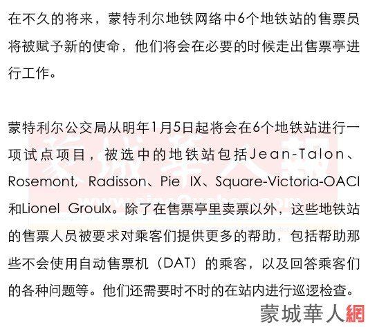 公交局认为,此举会近售票员和乘客们之间的距离,从而进一步提各高地铁站客户服务的质量。 公交局事会主席Philippe Schnobb表示,公司希望地铁售票员的工作方式和地点更加灵活,并且加强和乘客之间的互动。这个试点项目是本提高客户服务质量来运行的。 公交局通信部门主管Odile Paradis表示,他们希望售票员可以更加接近乘客,以有效的满足他们的需求。比如说,售票员如果发现一名乘客看起来似乎不知道该坐哪一趟车,那么他可以从售票亭里走出来对其进行帮助。 |