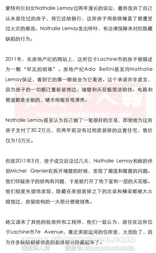 在发现问题一年之后,前房主Arnil Rambally在接受地产经纪Ada Bellini女士的律师询问时承认,是他在烧焦的结构旁边安装了保温层、石膏板等。 前房主Arnil Rambally坚称,在出售房屋前他曾经向地产经纪提到过很久以前的火灾。但是,双方意见的分歧在于,他到底都说了些什么。 对于Nathalie Lemay来说,致命的一击来自2012年底,她的新律师告诉她,诉讼还需要三年时间才能有结果。经过两年的斗争,她的银行账户已空,最后不得不停止支付贷款,让银行收回了这套房子。她为了这所自己从未居住过的房子付出了超过9万元,其中包括3万元首付金和2.5万元律师费。 2013年,新经纪公司Re/ Max再次将这所“会给买房人带来风险和危害”的房子挂牌出售,贴出的照片依然漂亮,但是口气已不再那么愉快,而是标出了“翻修警告”。 2014年3月,一位掌握了所有实情的买家成为了房子的新房东,他以23.5万元的价格,购得这所市政评估价值为36.48万元的房子,比Nathalie Lemay 3年前少付了6.7万元。 在巨大的损失面前,人们可能试图认为是由于Nathalie Lemay的疏忽,没有在预购前进行验房。但是,情况完全不是这样。她非但提前做了验房,而且聘请的是经验丰富的验房师Angelo Laforte,此人还是魁北克建筑验房师协会的会员。两年之后,Nathalie Lemay仍然怨恨Angelo Laforte验房时的草率。她说,如果验房师把应该看到的都看到了,自己肯定不会购买这所房子。 发现问题之后,Nathalie Lemay聘请了另一位验房师Yvon Boulais来分析Angelo Laforte的工作,他的报告就不再那么温和了。报告中写道,地下室木头烧焦的痕迹、屋顶变软和水泥墙变形的情况都非常明显。 前验房师Angelo Laforte的女儿及公司发言人Cynthia Laforte在一封信中对此争辩道:验房中几个主要问题都已经发现。其他则是客户自己应该考虑的问题。Cynthia Laforte坚持认为,他们所做的验房报告是很直观的。至于其它问题,需要新的专业鉴定。 Yvon Boulais也明确指出,如果不打开墙壁,他很难看到烧焦的房梁,而委托书中并没有打开墙壁的要求。但同时,验房师 Yvon Boulais也谴责了前一份验房报告模糊不清的问题。 Yvon Boulais写道,验房师的报告应当更加明确清楚,以使购房者能够了解到建筑损害的严重性。 那种“复制/粘贴”类型的模糊不清的报告在验房这个行业中还是非常普遍的。通常,验房师以需要聘请其他专家进行调查来推卸责任。 |