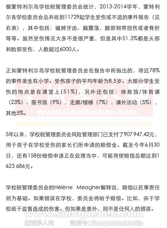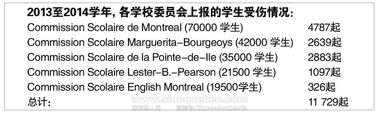 Hélène Meagher举例说,几年前,一位父亲提出赔偿申请,他的儿子在学校的院子里发生了动脉瘤破裂的意外。学校委员会对此并没有责任。因此家长没有获得赔偿。 尽管上报的大部分意外或受伤事件都不是很严重,但是依然令很多家长担心自己孩子在学校的安全问题。 蒙特利尔校委会家长委员会的eve Kirlin悲叹道,有些学校的监督是最低限度的,而院子里的设施也并不适当。而且由于政府宣布的大量削减教育经费政策,情况还可能会因此而变得更糟。 魁北克大学(UQAM)教育和专业培训系教授Gérald Boutin也对于上报的事故数量之多表示“惊讶”。他说,小学是孩子们学习同他人相处的非常敏感的地方。孩子们在身体方面的接触非常多。因此学校的监督至关重要。 6年来,蒙特利尔学校关于学生受伤或不适的报告数量增加了一倍。这个现象的部分原因可能是由于学校害怕被不满的家长们起诉。2008-2009年,只有6907起事故报告,而去年则上报了11 729起。 学校税管理委员在报告中解释说,事故报告的增多是因为学校“越来越警惕”,对事故、特别是无严重后果的事故都要通报。 魁北克学校管理者联盟的Lorraine Normand-Charbonneau说,我们生活在索赔和起诉越来越多的社会。学校会把所有的情况都记录在案,哪怕只是一些很小的意外也会记录下来,以便一旦被追诉就可以拿出证据对应。学校这样做在保护自己。因为学校注意到,家长们的反应比以前快很多,有些人会迅速采取行动,并威胁将提出起诉。 蒙特利尔学校管理层协会也注意到了这个现象。协会主席Hélène Bourdages强调,一旦某个孩子被球砸到了脸,学校不愿冒险,会马上提交事故报告。 不幸的是,意外是无法预测的。学校时刻都在提防意外发生。家长们通常都能够理解。可是也有些家长会说,发生事故是学校的错误,但是那必须得到证实。 |