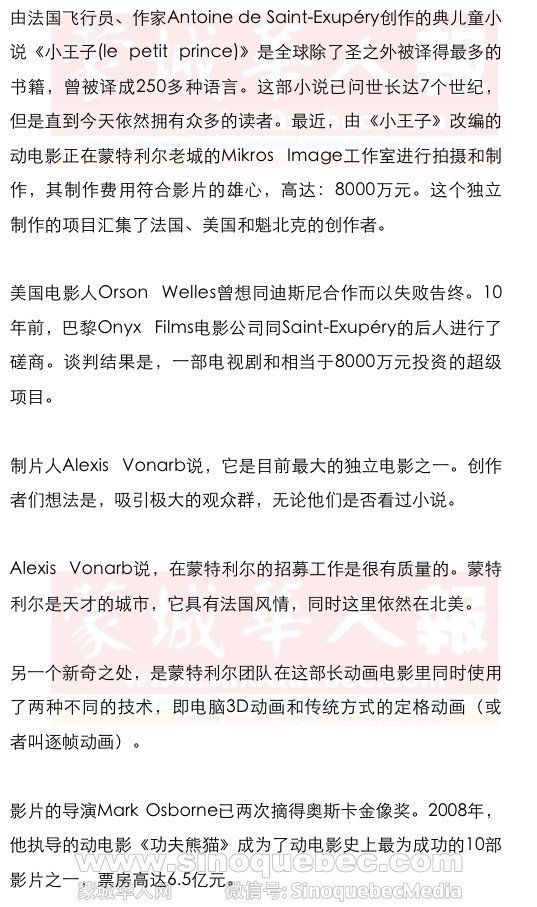 Mark Osborne,今年44岁,基于对《小王子》一书的热爱,一年前离开斯蒂芬·斯皮尔伯格(Steven Spielberg)的梦工厂动画公司来到蒙特利尔。他强调,重要的是,从一开始就要保护这本书。他说,在自己上大学的时候,是他当时的女朋友,后来成为了他的妻子,让他读到《小王子》这本书。使他开始了解这本书的力量。 影片将由全明星献声:英语版可以听到Jeff Bridges、James Franco、Rachel McAdams、Ricky Gervais和Benicio del Toro的声音。曾主演《玫瑰人生》而获得奥斯卡金像奖最佳女主角 的法国女演员Marion Cotillard将同时为英语版和法语版的小玫瑰配音。那么小王子呢,谁来用声音诠释这个被无数大人和孩子喜爱了70年的角色?他就是导演Mark Osborne的儿子Riley Osborne,他曾经在父亲执导的《功夫熊猫2》中为豹子太郎的童年配音。 电影预告片将在今年12月17日发布。而3D版的动画片《小王子》将于2015年冬季上映。 《小王子》是法国飞行员、作家Antoine de Saint-Exupéry在1943年的作品, 是一则关于爱与责任的寓言,一个世界上最温柔的故事,在其富有诗意的哀愁中蕴含着一整套哲学思想,。故事讲述了一名飞行员在撒哈沙漠坠机,遇到了一个自称是来自B-612星球的王子的男孩,后者跟他讲述了自己在众星球和地球的游历。 此前这个故事也曾被改编成动片、话剧和音乐剧等艺术形式,将这样一部经典作品改编成电影是一个挑战。 |