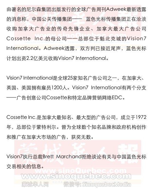 Cossette的广告客户包括加拿大通用汽车公司(Genaral Motors Canada)和麦当劳(McDonald's)等大牌企业。其经典作品包括为加拿大贝尔(Bell Canada)制作的Frank和Gordon两只水獭(Beaver)精彩对话的一系列广告。 更多Cossette创意广告可见网上资料库:http://www.welovead.com/cn/agency/details/e00Ehuo#by_update 来自中国北京的蓝色光标成立于1996年7月,在中国设有23个分区办事处,现有员工近5000人。据该公司资料显示,他们长期为P&M宝洁、可口可乐、联想(Lenovo)、思科(Cisco)、佳能(Canon)、腾讯、百度、索尼(Sony)、博世(BOACH)、长城葡萄酒、雅诗兰黛(EsteeLauder)、欧莱雅(Loreal)、轩尼诗、蒙牛乳业、中国联通、中国工商银行、中国平安、渣打银行等客户提供广告和媒体推广告服务。近四年来,蓝色光标通过在全球收购兼并一系列广告企业,市值从上市之初的30亿元增长至目前的220亿元。 蓝色光标传播集团国际业务总裁郑泓(Holly Zheng)女士近日在接受采访时表示,加拿大肯定是该公司国际扩展计划的一部分,因为加拿大是一个幅原广阔的大国,也与中国保持着良好的合作关系。但是,郑泓表示在任何事情没有落实前不愿谈及加拿大最大广告公司Cossette,因为市场变化不定,无法预言最后的结局。 郑泓女士表示,蓝色光标在收购欧美企业后会保持他们原有的结构,以保障他们业务的发展。但是,他们希望今后能与国外的设计公司和公关公司协作,将北美先进的创意理念引进到中国,如数据发掘和分析等,蓝色光标未来有意在新的项目——大数据技术方面投入更多财力和精力。 深交所10月20日午间公告,公共传媒出现关于北京蓝色光标品牌管理顾问股份有限公司的信息,可能对蓝色光标公司股票交易价格产生较大影响,经公司申请,公司股票(证券简称:蓝色光标,证券代码:300058)及其衍生品种(证券简称:12蓝标01,证券代码:112135)于2014年11月20日下午开市起停牌,待公司通过指定媒体披露澄清公告后复牌。