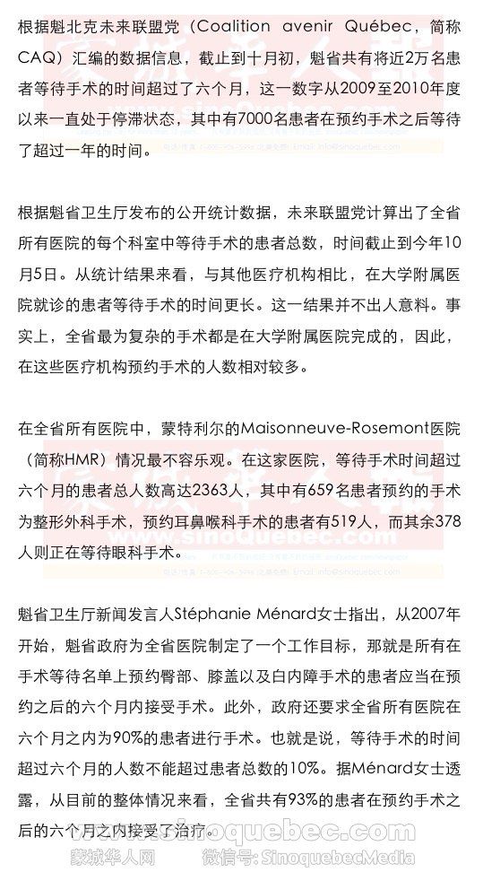 在蒙特利尔大学医疗中心(Centre hospitalier de l’Université de Montréal,简称CHUM)下属的三所医院,共有2705名患者等待手术的时间超过了六个月。其中,仅在Notre-Dame这一所医院,就有1783名患者属于此类情况。从三所医院的统计数据来看,等待手术时间超过六个月的患者主要集中在整形外科(949人)和耳鼻喉科(234人)。据医疗中心新闻发言人Sylvie Robitaille女士指出,该机构每年为患者进行的手术超过35000例。在该院预约手术的患者中有93.4%都在六个月内接受了手术治疗,达到了魁省卫生部制定的工作目标。Robitaille女士还补充道,在决定病人手术的优先顺序时,该院一直以三个因素作为参考标准:情况的紧急程度、患者的病情危重程度以及其他临床因素。 在魁北克大学医疗中心(Centre hospitalier universitaire de Quebec)下属的五所医院,共有2656名患者等待手术的时间超过了六个月。其中,仅在Saint-Francois d’Assise医院的骨科,就有979名患者属于此类情况。魁北克大学医疗中心的新闻发言人Geneviève Dupuis女士解释称,全省所有医院每年进行的急诊手术(如开放性骨折)平均占全年手术总数的18%,而在Saint-Francois-d’Assise医院进行的手术中,有29%属于此类情况。由于需要优先进行的急诊手术数量较多,该院不得不将一部分择期手术的时间向后推迟。这是患者等待手术时间过长的主要原因。 尽管如此,但未来联盟卫生事务新闻发言人Eric Caire坚持认为,在魁省,等待手术时间超过六个月的患者数量太多。他指出,这说明政府在公共卫生服务方面的工作十分失败。由于等待手术的时间过长,成千上万魁省患者的生活质量受到了影响。 对此,魁省卫生厅厅长办公室方面则回应称,为了改善目前的状况,政府付出了“切实努力”并取得了一定成效。在2008-2009年度,全省医院总共进行了38万8000例择期手术。而如今,全省每年完成的择期手术数量增加到了47万1000例。这就是一个有力的证明。 |