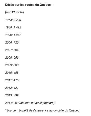 SAAQ负责人Nathalie Tremblay表示,SAAQ的盈余要感谢广大魁北克驾驶员过去七年来安全的驾车习惯,令SAAQ支付更少的保险赔付。从2006年起,魁省死于道路交通事故的人数降至每年1000人以下,2009年起降至500人以下。 1973年以来魁省交通事故死亡人数统计 魁省政府实行“无责任汽车保险法案”(55号法案),魁省司机出车祸撞伤他人后不追究其过失责任,由魁省汽车保险局向受害者支付保险金,而非由司机承担。SAAQ收取的注册费存放在信托机构,用来赔付交通事故死亡的受害者。 |