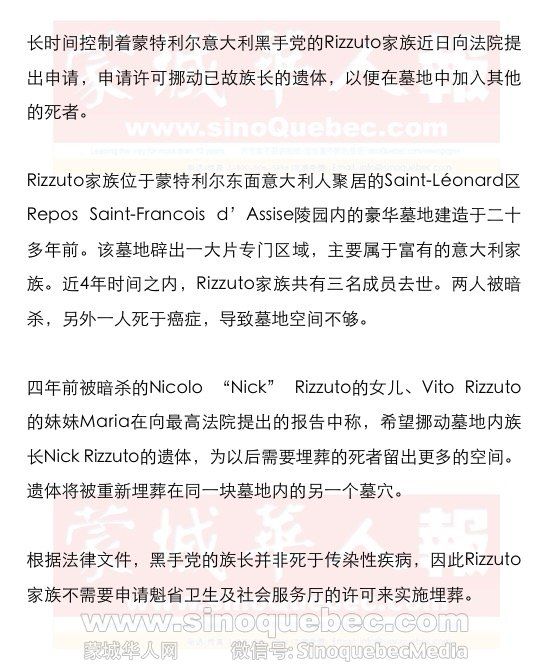 2010年11月10日晚,86岁的前黑手党大佬Nicolo“Nick”Rizzuto当着妻子和女儿的面,在位于蒙特利尔Ahuntsic-Cartierville区的自己家中厨房被人杀死。狙击手埋伏在豪宅旁边的树丛中向其射击。子弹穿过了厨房的窗户,当时一家人似乎正在吃晚饭。 2009年12月,Nicolo Rizzuto的孙子Nick Jr,从Notre-Dame-de-Grace区被人当街杀死。几个月之后,Maria Rizzuto的丈夫Paolo Renda在打高尔夫球回来的路上被人绑架。从此下落不明。 2013年12月,Nicolo Rizzuto的的儿子,蒙特利尔黑手党教父Vito Rizzuto死于肺炎。一年之前,他刚刚从美国监狱获释。入狱的罪名是参与谋杀纽约黑手党Bonanno家族的主要成员。 |