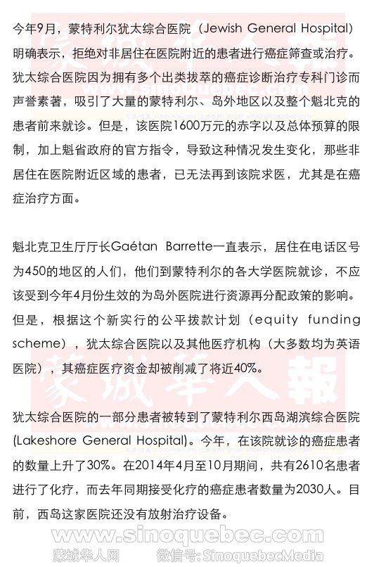 麦吉尔大学医疗中心初级保健部主管、家庭医生Mark Roper表示,政府的做法是换汤不换药,但却会让情况越来越糟糕。Roper警告说,省政府之前的开放资源、开放医院病床以及向这些地区派送家庭医生和医疗专业人士的公平拨款计划,已经执行了有10年的时间了,但是却让蒙特利尔的情况变得更糟,因为根据公平拨款计划,医院的资金并不是依据病人数量的多少来划拨的。现在推行的资源再分配政策,其结局也会如此。 加拿大结肠癌协会(Colorectal Cancer Association of Canada)的主席Barry Stein举例说,当魁北克城的结肠镜检查室空置的时候,在蒙特利尔却有大量的人排在等候名单上,等待进行结肠癌筛查。有大量的医生也不认同政府的这项政策。 一位外科医生表示,这并不是一个患者的邮政编码或是电话区号的问题,官方指令已经下达,要通过限制检查的数量和类型来节约资金,在这样的条件下工作,让他感到不舒服。这位外科医生表示,医生们全力要做的是,让人们尽可能地感到舒适,但是,将那些非居住在医院附近地区的患者转出,则是违背这样的宗旨的。 对于被转往所居住社区的其他医疗机构,到离家更近一些的地方进行治疗,确实有一部分患者是感到宽慰的,这是因为癌症的治疗总是会使人精疲力竭的。但是,并不是所有人都这样的。Segal癌症中心的妇科肿瘤部门的主管以及麦吉尔大学外科肿瘤部门主管Walter Gotlieb表示,告知患者医生们不能再为他们看病了,这是一件很令人尴尬和难为情的事情,但是因为压力,这种事情却在最近变得司空见惯。 Gotlieb表示,如果患者在离家近的地方能够得到同样的治疗,他们理所应当前往,但现在的问题是,这几乎是不太可能的,这是魁北克政府必须要严肃地进行思考的问题。他还补充说,当涉及高度专业化、专门化的治疗的时候,从长远来看,将会消耗政府更的资金。 |