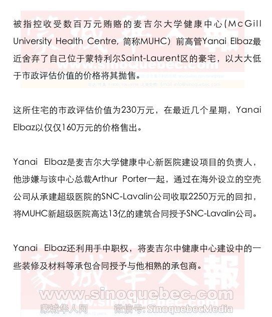 据媒体调查,这些承包商为了回馈Yanai Elbaz,在其建造Saint-Laurent区豪宅时提供了无偿的装修等。据媒体披露,MUHC的一名供应商Maurice O’Hana,曾经借出超过50万元来装修这所房子。2006年和2007年,供Hopital Royal-Victoria医院使用的材料也被挪用来修建此豪宅。 加拿大税务局展开调查发现,Yanai Elbaz的这幢豪宅欠税110万元。另外,这所位于Saint-Laurent区Robert-Choquette街的房子还面临魁省税务局和加拿大税务局总共220万元的法定抵押,以保证其所欠税款得到偿还。 正如11月11日签订的售房公证书上所指出的,该幢房屋的出售用于偿还与之相关的法定抵押。房子的新户主,la fiducie familiale Nkana,将于明年1月4日起可以进住。不过,房子的预售合同早在今年6月份就已经签署。 在麦吉尔大学健康中心新超级医院建设中,已有8人因涉嫌贪腐被拘捕或起诉,其中包括SNC- Lavalin公司前执行总裁 Pierre Duhaime、该公司建筑分部前总裁 Riadh Ben Aissa、前副总裁兼总会计师Stéphane Roy。目前以治疗癌症为名滞留巴拿马的MUHC前总裁 Dr. Arthur Porter和他的妻子被通缉,其妻子 Pamela Porter已返回蒙特利尔受审。英国工程咨询专家 St. Clair Armitage于2014年6月交纳75000元保释金后回到英国。巴哈马律师Jeremy Morris。 Yanai Elbaz于2013年2月被拘捕,他被控涉嫌欺诈、欺诈政府、背信、洗钱和伪造文件等。他的律师弟弟Yohann Elbaz也同时被捕。在弟弟Yohann Elbaz所属的 Pan Global Holdings公司帐户中,警方查证他们收受了1125万非法贿金。Yanai Elbaz在交纳了10万元保释金后获释,他的获释条件是不与工程公司SNC-Lavalin或MUHC的员工进行交流。必须每周亲自到魁省安全厅报道。不过,警方没有没收他的护照或旅行证件,这意味着他仍由出国旅游的自由。 |