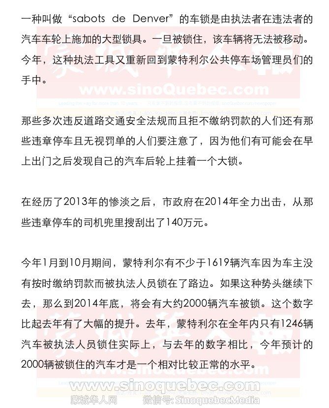 专门负责帮客户对罚单进行上诉的SOS Ticket公司的创始人Alfredo Munoz对市政府的这种做法进行了谴责,他认为市政府是在从那些已经没钱的人的兜里搜刮钱财。那些被执法人员们用车轮固定锁把车固定住的人们并不是因为疏忽才没去缴纳罚款的,是因为他们实在没钱了。有些人只身负担全家的开销,而还有人则刚刚丢掉了自己的工作。 蒙特利尔市政府的新闻发言人Patricia Lowe解释说,警方只会在极端情况下才使用车轮固定锁将违法者的车轮固定在地面上。通常,被锁住的都是那些手中握着多张罚单但拒不缴纳罚款的车主。在某些情况下,车主所欠下的罚款可以追溯到10年以前。为了在这些极端情况下劝诫车主缴纳拖欠罚款,车轮固定锁被证明是最为有效的方式。 在市政府于近期公布的一份文件中,我们可以看到,车轮固定锁是帮助市政府从那些屡教不改或是难以被定位的违法者手中追回欠款(包括罚款和其他费用)的重要手段。该文件的作者是市政府的多名高官。这些官员承认,车轮固定锁是市政府产生收入的方式之一,因为在所有车辆被锁住的车主中,有83%缴纳了自己拖欠的罚款。 对此,SOS Ticket公司的创始人Alfredo Munoz谴责到,这再一次证明了警察们最主要的目标是挣钱,而不是执法。 警方使用车轮固定锁的5个步骤 1 法院发出判决书,允许警方从欠款的违法者手中收回欠款 2 执法人员开始拿着欠款者的名单在蒙特利尔巡逻。一旦发现了欠款这的汽车,执法人员会马上用车轮固定锁将其锁住 3 从上锁一刻开始,车主有24个小时的时间来支付拖欠的罚款。否则这辆车就会被拖走,在车主必须全额缴纳拖欠罚款和其他所有相关费用才能把车开走 4 83%的情况下,车主会支付欠款,方式包括直接支付全额、承诺分期付款或是通过做社区工作来还款 5 如果车主在车辆被拖走后20天仍然没有联系警方,那么警方将在保证司法公证的前提下将该车辆出售。 |