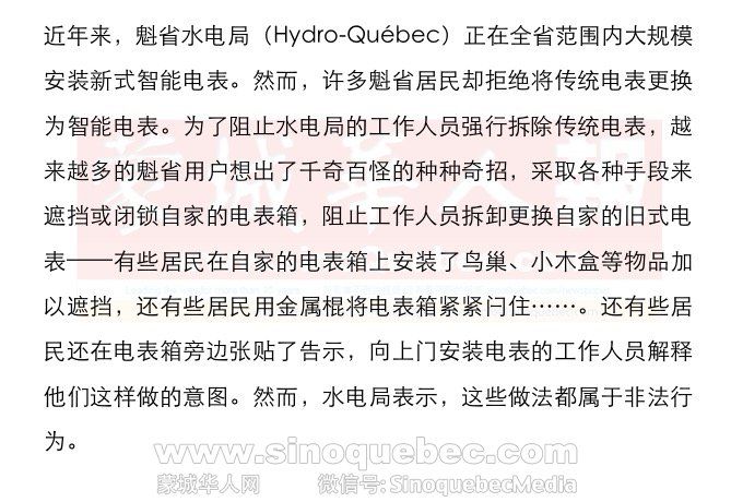 根据魁北克反大气污染协会(Association québécoise de lutte contre la pollution atmosphérique)提供的统计数据,截止到2014年10月30日,魁省水电局总共在全省范围内安装了约200万台智能电表,约有17441台旧式电表的表箱被人为遮挡或封闭,致使工作人员无法进行拆卸操作并更换新式电表。魁省水电局则表示,遮挡和封闭电表的做法存在多重风险。该公司的新闻发言人Serge Abergel先生强调称,所有用户都必须确保,魁省水电局的工作人员能在任何时间打开他们的电表箱进行操作,这是每个用户的义务。不仅如此,Abergel先生还指出,在电表的基座位置钻孔来封闭电表箱将有可能导致绝缘层破损,从而引发漏电事故。这将有可能对操作者造成致命伤害。任何一名用户都不应该拿自己的生命冒险。 目前,水电局的工作人员在上门为用户更换新式智能电表时如果遇到了电表箱被封闭、无法拆卸旧式电表的情况,会在用户的家门口留下一份到访通知。 尽管如此,但魁省水电局方面表示,根据魁省能源管理委员会(la Régie de l’énergie)做出的决定,全省所有用户必须统一更换新电表,无一例外。 通过使用智能电表,魁省水电局可以实现远程抄表,即通过无线电采集用电量数据。部分民众认为智能电表发射的无线电波会产生电磁辐射,因此决定安装退出安装计划。 魁省水电局为这些用户设计了另外一套方案,那就是将家中目前使用的电表更换为不具备无线通讯功能、不发射无线电波的传统电表,每月由抄表员到用户家中抄取电表读数。魁省水电局将按月向这些用户收取相应的人工抄表费。此收费将确保抄表的成本不会被转嫁到智能电表用户上。能源管理委员会对此表示认可。 Abergel先生同时指出,部分用户通过种种不同的方式表示拒绝安装智能电表,比如向水电公司寄送反对通知书(avis de non-consentement)、通过在电表盒上粘贴字条来向上门安装的工作人员说明意图等等。此类行为都将被视为无效反对,魁省水电局不会因此而改变新式电表的安装计划。 魁省水电局还信誓旦旦地向全省用户保证,更换新式电表与用户的电费账单变动没有任何关联。该公司声称,一些居民的电费账单之所以出现增长,主要原因有两个,一方面,冬季天气寒冷,用户在家中使用取暖设备,因此导致了用电量增加。另一方面,部分居民的用电习惯改变,这也导致了电费增加。 电气工程师Pietro Arella先生同样表示,新式智能电表出现这种故障情况的可能性较高。他解释称,智能电表是由大量的电子元件和装有微处理器芯片的电路板组装而成,这种电路板十分脆弱易损。而与之相反,老式机械电表的内部机芯结构较为简单,仅仅由线圈和导线组成。据这名工程师介绍,内部电子元件的数量越多,电表发生故障的可能性越高。因此,与传统的机械电表相比,新式智能电表更容易出现故障并且导致用电读数异常。 而魁省水电局对此则表示否认。该公司声称,他们在魁省大规模安装的新一代智能电表性能安全可靠,计量的精准度非常高。反对人士所说的可能性根本不存在。到目前为止,魁省水电局总共为全省用户更换了250万台新式电表。如果该公司继续保持这一安装进度,从现在起到2016年底,他们在全省范围内安装的新式电表数量将达到380台。 |