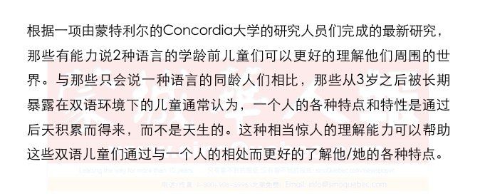 为了得出这个结论,研究人员们总共采访了48名年龄在5岁到6岁的儿童,他们当中有些只会说一种语言,而另外一些则已经学会了2门语言。测试的内容非常简单,研究人员向这些小朋友们讲了两个故事:第一个故事是一个由说英语的夫妻生下的婴儿,在生下来之后就被一对意大利夫妇领养;另外一个故事则是讲的是一只被狗养大的鸭子。随后,研究人们问这些孩子:第一个故事中的孩子长大之后是说英语还是意大利语?而第二个故事中的小鸭子长大之后是“嘎嘎”叫还是“汪汪”叫? 研究人员们在测试过程中发现,那些先后学会了2门语言的孩子们认为,被意大利父母养大的小孩会说意大利语而不是英语;但是他们中也有一大部分认为动物的习性也同样是通过学习而得来,也就是说他们认为被狗养大的鸭子会汪汪叫和快跑,而不会嘎嘎叫和飞翔。 该研究的负责人Krista Byers Heinlein在接受采访时表示,无论是会说一种语言还是2种,这2组孩子们都或多或少的在测试中给出了错误的答案,但是他们犯下的错误类型不同。那些只会说一种语言的小孩通常会认为一些都是天生的,包括语言和行为;而双语儿童中则有一大部分认为人类和动物的一切习性都是通过后天学习而来的。 Krista Byers Heinlein表示,通过这项研究,他们认为小孩在年轻时学习第二种语言有着重要的意义,因为这可以帮助他们更容易的接受社会多样性以及不同类型的人之间的生理上的差别。 这项研究的成果将会被公布在近期的美国《科学发展》杂志(Developmental Science)上。 |