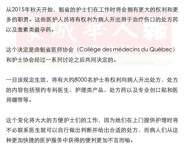 魁省护士协会(Ordre des infirmières et infirmiers du Québec)会长Lucie Tremblay表示,很多溃疡类的伤口——比如褥疮,会对病人造成巨大的痛苦。在这个变化生效之后,那些本来就行动困难的患有褥疮的病人们将不必要费时费力去诊所见医生。在护士的帮助下,他们可以更快、更方便的获得他们所需要的药物,这很有利于伤口的恢复。 除了伤口护理类的药物和产品以外,护士们还将有权利为病人开出一些帮助戒烟的药物,以及不同种类的激素类避孕药。Lucie Tremblay认为,这将极大的提高广大群众获得避孕药的便利性。 关于处方避孕药,Lucie Tremblay认为这个变化主要影响到的将是那些在各个学校中工作的护士们。她认为,年轻人通常在谈到避孕这个话题时会感到害羞甚至害怕,但是在驻校护士的帮助下,他们将更容易的获得避孕药和避孕产品,而且这样也有助于保护他们的隐私。在这种前提下,年轻人们的自我保护将会变得更容易。 除了上述药物以外,护士们还有可能会被赋予开出更多处方药的权利,包括用于治疗无症状的淋球菌感染或是衣原体感染的药物等。 |