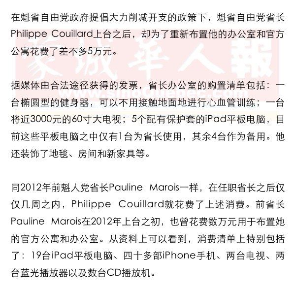 自由党省长Philippe Couillard还聘请了一位设计师来装饰和“润色”他的一间办公室,可能铺设了地毯及搭配了四幅风格不同的装饰画。此项支出为2600元。另外,政府执行委员会还花费将近1.5万元来为省长的办公区域添加桌子、书柜、椅子、沙发、扶手椅、灯具、文件柜和茶几等家具。 省长位于Saint-Félicien和Dolbeau-Mistassini的办公室也配备了电讯服务设备以及布线,此项共花费纳税人1万元。 省长办公室发言人在接受媒体询问时,试图模糊这些信息,并表明这些花费中的一大部分是直接同政府的更迭联系在一起的。 Philippe Couillard省长发言人保证,自由党内部已经展开了共同节俭的努力。目前已经采取许多措施来减少支出。比如降低薪酬、取消外出就餐、聘用学生等。发言人总结道,政府成员深知,他们不能一味要求别人做出努力,必须要以身作则。 前省长Pauline Marois在2012年上台之初,也曾花费数万元用于布置她的官方公寓和办公室,购买了包括ipad, iphone, 电视等,而两人的权力交换期不到一年。难道这些装饰都没有用?电子设备都被淘汰了?政府权力更换之后,这些设备将去向何方?…… 政府行政执行委员未能提供相关信息。省长发言人Harold Fortin试图消除民众的疑虑。他说,即使政府更换,财产和家具的跟踪也会“照章”进行。然而,此项管理被划分到不同的政府机构,比如魁北克共享服务中心(Centre de services partagés du Québec)及各个部委。但他保证,现政府一定会重新使用前政府购买的所有器材。 |