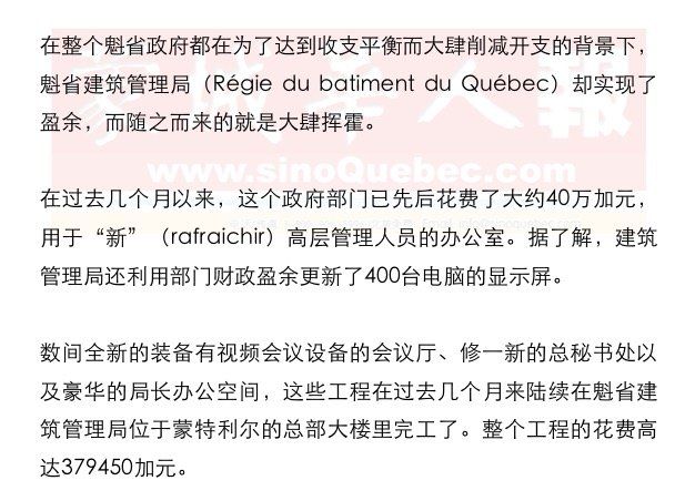 这一系列豪华装修在魁省政府内部引起了一些负面反应,因为在政府财政紧缩的大环境下,所有的政府部门和下属组织都在缩减预算。 魁省建筑管理局的一名内部员工表示,自从现任局长Stéphane Labrie到来之后整个部门的风气都变了。 被前省长Pauline Marois任命为魁省建筑管理局局长的Stéphane Labrie在2012年曾是魁人党在Lévis选区的选举代表,不过,他在选举中败选。魁人党上台后提拔他担任公营机构的主管,也算是变相回报。 魁省建筑管理局目前还在着手为大量员工更换电脑显示屏。这些尺寸达到23英寸的大型显示屏的成本为每个250加元,总开销高达10万加元。 魁省建筑管理局的新闻发言人Sylvain Lamothe解释说,在一次大规模软件更新之后,有不少员工都发现自己的电脑出现了显示方面的问题,因此管理层在无奈之下才做出全面更换显示屏的决定。 但是在该组织内部,人们却在不断质疑这笔开销到底意义何在。多名匿名接受采访的员工都表示,在更换新显示屏之后,一切还是和以前一样。至于以前的那些老显示屏,服役时间大都在5到10年期间,还远远没有老到需要被报废的程度。Sylvain Lamothe表示,被替换下来的这些显示屏会被折价出售给其他政府组织,或是被转移到一家专门为学校装备电脑的公司。 Régie du batiment du Québec是监管魁北克省建筑条例的机构,魁省境内的民用和商用建筑,都由该机构进行管理。凡是与建筑有关的问题,如装修、建筑质量等,均由该机构进行仲裁。由于通过发放建筑商许可证而收到了大量的申请费,魁省建筑管理局在其他政府部门普遍入不敷出的情况下依然能够实现年年盈余。 2014年,魁省建筑管理局实现了950万加元的盈余,而且到目前为止已经先后积累了超过7600万加元的总盈余。这其中包括一个2700万加元的用于应对紧急事件的储备基金。魁省建筑管理局的新闻发言人Sylvain Lamothe表示,魁省建筑管理局所实现的全部财政盈余都被存放在了组织内部。 |