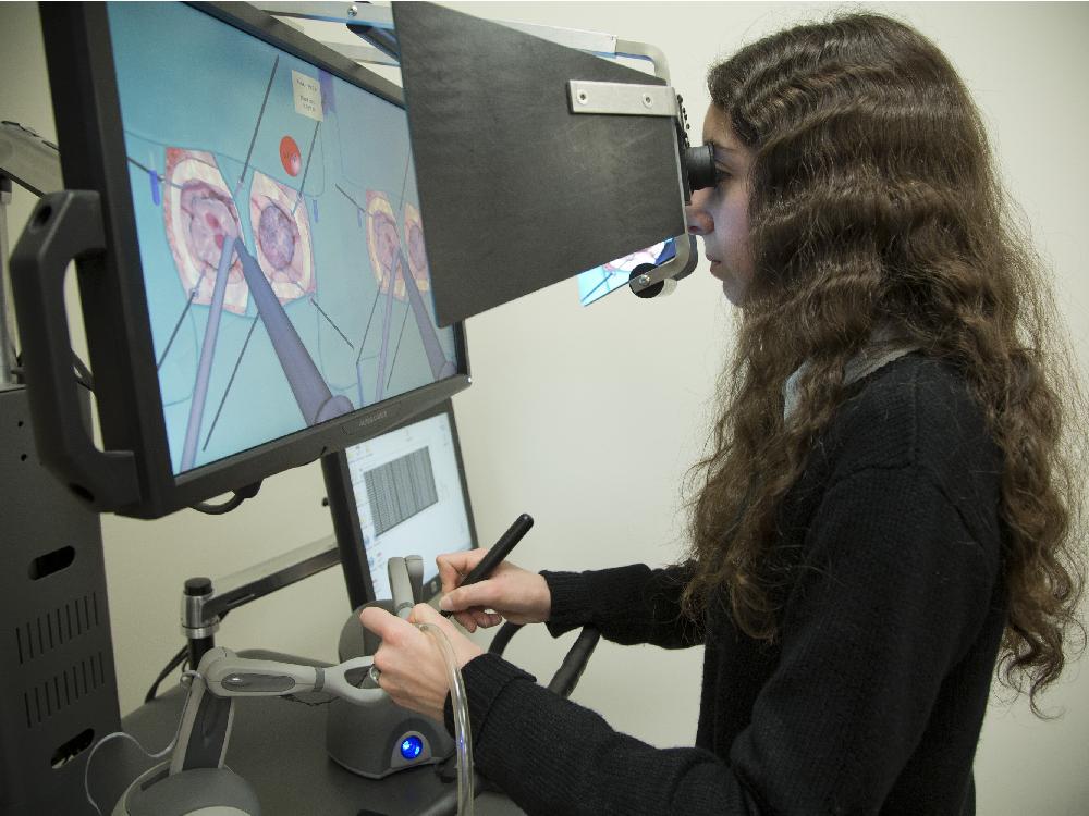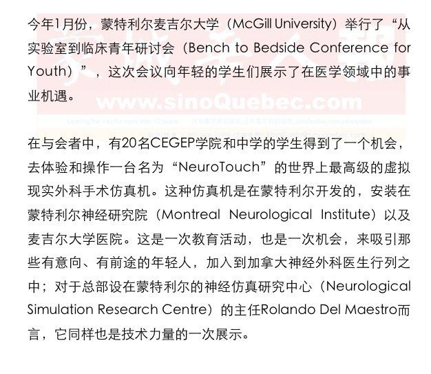 Del Maestro相信,NeuroTouch将会开创一个外科手术训练的革命性的新纪元。众所周知,飞行模拟器的出现改变了航空工业,它为世界范围的飞行员提供了快速而均等的训练机会。Del Maestro认为,他的医疗模拟装置,再加上几个月之后在现在的皇家维多利亚医院的位置上修建的一所新的研究与培训中心,也可以加速神经外科手术的培训,并且为全球的外科医生打开了大门,使他们获得同样水平的医疗教育。在这条道路上,加拿大一直处在领先的位置上。 参加这次活动的这些学生,都是本次青年研讨会上的获奖者。他们将在医生的指导下操作NeuroTouch仿真机,来区分肿瘤和脑组织。 来自Saint Antoine Exupery中学的11年级学生Nehad Achi,她紧紧地握住两个像圆珠笔一样的器具,通过显微镜,与一件震荡频率超过20,000赫兹的超声波器具联动,来切除暗橙色的脑肿瘤。在这个过程中,她还使用了另一件器具,吸走流出的血液。Achi说,她在进行“手术”的时候,心率监护仪在“嘀嘀”地响着,甚至与“患者”的仿真心脏跳动相一致的脑组织的轻微脉动都可以看到。“病人”在“手术”过程中出了很多血,以至于当时她以位这位“患者”可能会死在她的手上。幸好,这不是一位真正的患者。虽然如此,仍然会让人紧张,当时她可以感觉到自己的心跳。她说,这是一种实实在在的压力。 外科手术大多都是通过让医学院学生,在6年或更长的时期内,站在手术台边见习手术来教学的。大多数的神经外科医生,通常是在毕业10多年之后,才能达到最熟练的程度。那时候,他们的年龄已经在40到45岁左右了。然而,如果能在一台仿真器上有更多的练习时间,将会迅速提高一名医科学生的技能,可以让他们在一个更长的职业生涯期内更精通和更熟练。 这多亏了总部设在蒙特利尔的加拿大国家研究委员会(National Research Council of Canada)的工程师们的艰辛努力,以及各所大学和公司的合作,使得加拿大在神经外科仿真技术上成为世界的领导者。举例来说,NeuroTouch可以将一名学生在手术操作中的手法来与一位专家进行对比,看一看是否他们在前进过程中遇到了困难。自从NeuroTouch在2012年进入市场以来,截止到目前,在世界范围内已经售出了20台。 Dal Maestro表示,未来的规划是要建造两个新中心,其中一个设在蒙特利尔,将配有数台NeuroTouch仿真机,这样,来自世界各地的医生就可以在所有外科领域中进行实习。他指出,这个潜在的市场是巨大的,仅仅在北美就有140,000名外科医生、350,000名牙科医生以及340万名护士。这种仿真机可以被用于所有国家的外科医生训练,从而提高全球医疗水平,因为其中有很多国家的医生获得培训的机会非常有限。这个目标听上去似乎是难以企及的,但是Del Maestro指出,他们的合作团队是在2008年的时候才决定来研制这种仿真仪的,到2010年就有了第一台原型机,等到2012年,第一台机器已经成功售出。 |