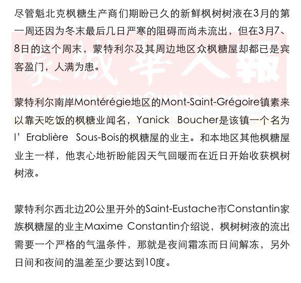 目前还无法预知魁省2015的枫糖浆产量是否会跟2013和2014那两年一样高。在2013年,魁北克出产了不少于1.203亿磅的枫糖浆,轻松地创本省历史新高。 在等待枫树释放出它们宝贵的浆液之时,数以百计的家庭陆续开始利用周末到枫糖屋吃了一顿魁北克传统大餐。 在枫糖屋业主Maxime Constantin看来,如果说近年来魁省枫糖屋正在经历一个人气的回升,那么这个回升在一定程度上是得益于各个少数族裔文化社群。Maxime Constantin说他并没有刻意讨好他的客人,但他确实很高兴看到不同族裔的人像社交聚会一样,到枫糖屋来进行一次典型的魁北克文化体验。 另一间枫糖屋的主人Mélanie Charbonneau说她家的枫糖屋接待很多来自日本和法国的旅游者。Mélanie Charbonneau认为日本人对枫糖屋的喜爱源于吃,因为日本人爱吃甜食,自然也就对甜甜的枫糖浆赞不绝口,而法国人则更钟情于在圆木搭成的小木屋和骑马遛弯儿中寻找自然的乡野乐趣。 蒙城华人网整理的蒙特利尔周边八个著名枫糖屋请见: