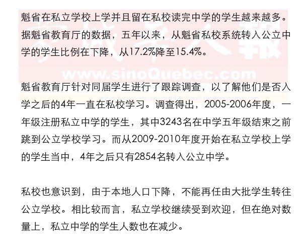 UQAM教育科学系教授Gérald Boutin则认为,私立学校的“品牌形象”依然是他们最大的优势之一。 私立学校的声望和它们所作的广告影响着父母们的选择。他们期望自己的孩子取得成功,在这方面,私校拥有巨大的竞争力。 Boutin教授对于私立学校学生留校率增高丝毫不感到惊讶。他说,一旦父母尝试将孩子送入私校,他们往往会愿意让孩子一直在私校上学。 但是,另Boutin教授感到遗憾的是,公校系统不断地被拿来同私校系统进行对比。他认为,两相比较是错误的。因为公立学校必须接收所有学生。 私校系统学生注册比例 2008-2009年度 中学: 19,2 % 所有学生: 12,2 % 2012-2013年度 中学: 19,2 % 所有学生: 12,5 % 私校系统注册学生人数 2008-2009年度 125 539人 2012-2013年度 124 283人 从私校转入公立中学的学生比例 2005-2006届 17,2 % 2009-2010届 15,4 % 信息来源:魁省教育、文娱和体育厅 |