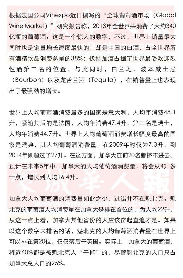 法国公司Vinexpo公司是每隔两年在波尔多举行的世界最大葡萄酒和烈性酒展览会的主办方。从1971年起,该公司一直受总部设在伦敦的一家公司---国际葡萄酒及烈性酒记录(International Wine and Spirits Record)委托,以5年为周期,详细地对世界范围内的葡萄酒和酒精消费进行研究,出具报告并且做出预测,酿酒工业在未来5年中的发展方向。该公司这份最新的报告,研究的区间是2009年至2013年,预计了2018年的世界葡萄酒及烈性酒的生产与消费情况。 Vinexpo的报告指出,就葡萄酒生产而言,2009年产量最大的3个国家,分别是法国、意大利和西班牙。从1971年Vinexpo公司获得委托首次进行这项研究以来,法国在葡萄酒产量上一直是第一名,但是到了2013年,意大利成为世界葡萄酒生产的领导者。这份报告预计,等到法国下滑到第三名的时候,西班牙将坐上老大的位置,意大利则位居第二。坐在第四位置上的将是美国,报告预计,这个加拿大的南方邻居,葡萄酒的产量在未来几年中将会超过法国。在过去5年之中,有两个国家的酒类产品产量迅速上升,一个是中国,其产量递增了69%,现在排在世界第8名。在增长速度方面,紧跟中国后面位居第二位的是南美洲的智利,同期产量上升了42.5%,现在排名世界第6位。 从葡萄酒的生产、销售以及消费来看,不管在哪一个方面,加拿大都排不进世界前10名。相对于世界其他国家,加拿大仅是葡萄酒的一个小生产商,而且这个国家的人喝的也不多。就算是在5年之后能达到人均年消费16升的水平,按每瓶1升容量计算,平均一个星期喝的量还不足一瓶的三分之一。在这一点上,加拿大人还有很长的一段路要走,不过,看起来似乎是加拿大人只能喝这么多了。 |
