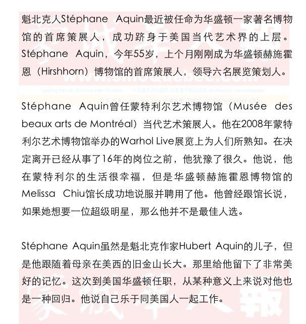 华盛顿赫施霍恩博物馆是美国国家级当代艺术博物馆。位于史密斯学会和航空航天博物馆之间,主要展示各式各样的现代艺术品和雕塑。该馆建立之初本是为了放置股票大王Joseph H. Hirshhorn收藏的20世纪绘画和雕塑作品,而今以演变成一个拥有文本、绘画、图片、雕塑和数字影像的新兴博物馆区。 Stéphane Aquin的新办公室距离美国国会大厦只有两步之遥。华盛顿的政治气候恐怕会影响到他对未来展览的选择。在那里所做的一切会都会带来特殊的反响,因为那里位于美国首都的心脏,周围围绕着各国使馆,毗邻美国国会大厦,那是一个战略的位置。 目前Stéphane Aquin正在筹备一项有关越南战争对美国艺术史的影响的展览。美国人知道博物馆的重要性,但是在此之外,并不真正了解很多,Stéphane Aquin想要改变这个现状。因此他计划将艺术作品以圆柱的形式投射在博物馆的正面。一位蒙特利尔艺术家可能会负责实现这一主题。 Stéphane Aquin利用整个秋天走遍了美国俄克拉何马州、科罗拉多州、亚利桑那州和新墨西哥州,目的是为了准备一场将于2017年在MBAM举行的大型展览。这是一个围绕着电影和西方神话起源的多媒体项目。他在很久以前就想这么做了。 |
