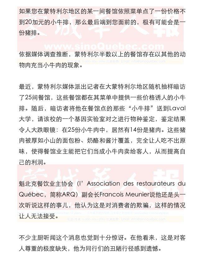 实验室鉴定结果出来以后,媒体逐一联络了那14家把猪肉当作小牛肉卖的餐馆,其中一些餐馆业主对他们的蓄意欺骗行为供认不讳。 位于蒙特利尔市Hochelaga街Jimmy餐馆的老板Jimmy Stefanatos说,他知道该餐馆菜单上的小牛排实际上使用的都是猪肉,但这也是不得已而为之,如果用真的小牛肉,那么这道菜的价格就会是29.95加元。 但被揭露的14家餐馆业主中的大多数,和Jimmy Stefanatos的坦白态度却是截然相反,他们在得知媒体的暗访调查结果之后,情绪骤然大变,语音立高八度,不承认该餐馆存在蓄意以猪肉冒充小牛肉的恶劣行为。甚至质疑媒体做此类报道的动机,觉得媒体这样做是出于对餐饮业的不满,亦或是种族攻击。 但为媒体做实验鉴定的Laval大学基因实验室负责人Louis Bernatchez从专业的角度说,在实验室的基因检测中,绝对不会把两类不同的物种弄混。他说在猪和小牛的基因中,不同的核苷酸多达136种,这足以让技术人员将这两种肉类轻松区分开来。 以猪肉充当小牛肉做成牛排卖给客人,这样的做法让某些餐馆老板获得丰厚的利润,因为在肉店,猪肉的价格相对低廉,通常比小牛肉要便宜4倍。 餐馆虽说是批量进货,但也遵循同样的价格规律。H4C餐馆的主厨Dany Bolduc向媒体出示了他的采购发票,其中猪肉的采购价格为6加元一公斤,而小牛肉则为30加元一公斤。思维严谨的Dany Bolduc认为也不能排除餐馆业主被肉类供应商糊弄的可能性,因为存在那么一些只注重产品外包装,而忽略产品质量的餐馆老板,他们在收货时甚至都不认真检查一下货物是否对板,就直接做熟了给客人端上桌。 |