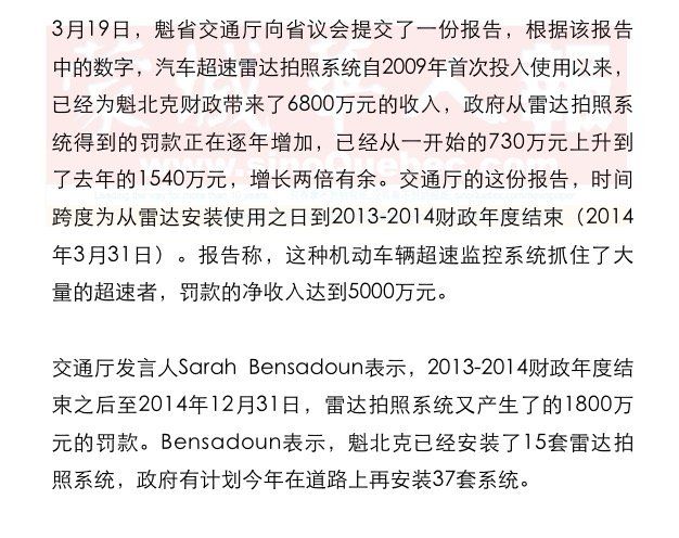 目前,从蒙特利尔驾车人的钱包中赚钱最多的有两套雷达系统,一套位于15号高速公路南向Atwater出口300米处,共产生了14,200张罚单,收到了290万元的罚款;另一套是在40号高速公路Vaudreuil-Dorion地区,位于40.7和36.9公里标记之间,在两年的时间里,这套雷达系统开出了390万元的罚款。这些资金都划拨进入到了道路安全基金(Fonds de la securité routière)之中,以保证雷达系统的运转,同时为道路交通事故的受害者提供帮助。魁北克交通厅厅长Robert Poeti表示,雷达系统的目标并不是为了赚钱。去年秋天,他曾经说,这些雷达拍照系统都是工具,展现了其效力和实用价值,政府将会继续使用这种系统。 根据报告,在很多处于雷达系统监控之下的区域,交通事故的数字已经急剧下降,其中包括15号高速公路Atwater出口附近一带,在这一区域,自从雷达系统安装以来,交通事故骤降73%。但是,交通法规专家、律师Eric Lamontagne指出,现在就做出雷达拍照系统已经使道路更加安全的结论,还为时过早。他表示,雷达拍照系统现在还不是道路交通中的常规部分,而且,政府也没有将魁北克的数据与其他一些在道路上每隔10公里就设有一套雷达系统的国家进行对比。 Lamontagne说,魁北克应该只在危险区域安装雷达拍照系统,而不应该类似施工区这样的区域安装,在这些区域,汽车超速的罚款都是要加倍的,这一点人们都心知肚明。他认为,如果政府要安装如此多的雷达监控拍照系统,就应该非常认真地选择在哪里安装,这样才不至于在民众的眼中失去公信,如果把它们安装在那些几乎没有交通事故或超速危险的地方,是非常错误的。 |
