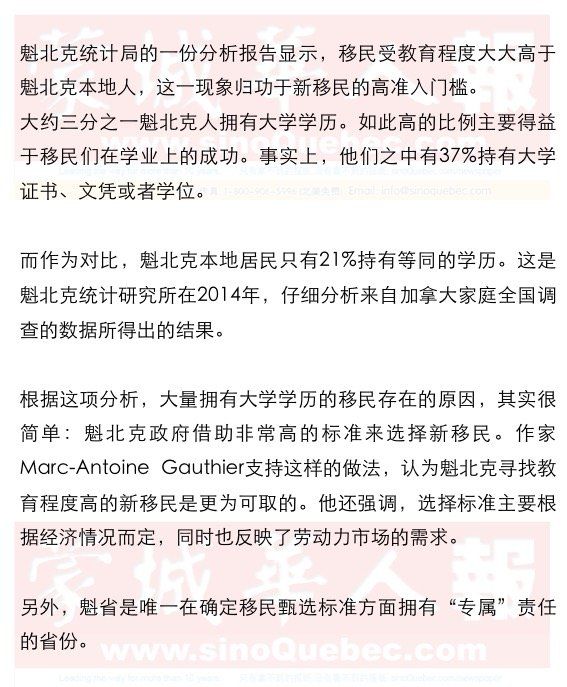 在涉及高等教育的所有领域,移民似乎都超过了“原生”魁北克人。比如,20%新移民拥有大学初级文凭,而魁北克当地人的这一比例为14%。然后,18%的移民拥有大学学士及以上(硕士或更高)学历,而魁北克本地出生人口只有7%拥有同等学历。 同大多数魁北克人一样,移民中很多都完成了商科、管理或公共行政管理方面的学业。 然而,移民主要在工程、建筑和科学领域同当地人有所不同,移民中20%拥有这些方面的学历,相反,本地出生的魁北克人完成此类学业的只有9%。 文凭比例 大学证书、文凭或者学位 移民 37 % 魁北克本地人 21 % 魁北克总体 20 % 高级文凭 移民 17,5 % 魁北克本地人 6,5 % 魁省总体 8,5 % |