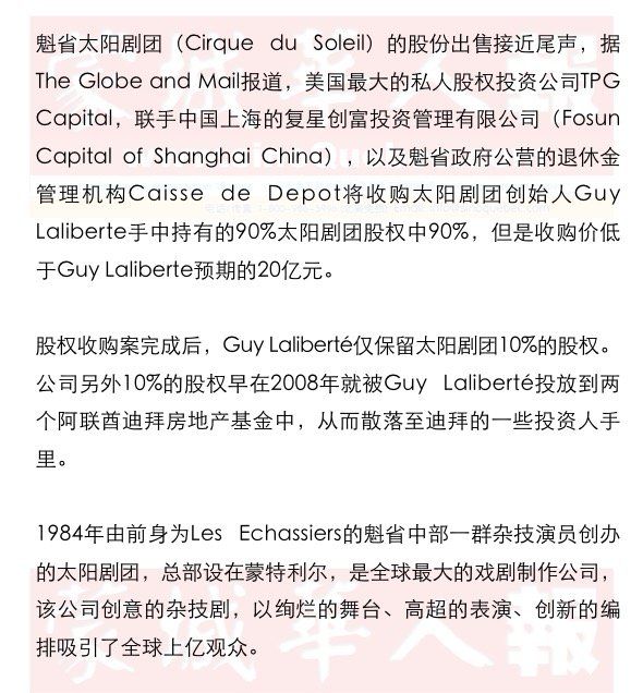 太阳剧团在蒙特利尔拥有1600名长期雇员,为避免企业易主造成的人员动荡以及其它不良影响,Guy Laliberté在股权出售交易达成之前产透露出希望他的接盘手能将太阳剧团总部留在蒙特利尔的主观意愿。 据媒体称,曾有一些蒙特利尔本地买家参与到太阳剧团股权出售的协商谈判中,但却令人失望地中途退出。 据悉,某些潜在买家选择退出太阳剧团的股份收购是因为“该企业的机密财务文件显示出企业的盈利能力正在不断减弱”。2012年是太阳剧团历史上首次无盈利的一年,为应对巨大的财务压力,剧团不得不在这一年大规模裁员,此后其全球员工总数由2008年以来的5000人猛然削减为4000人。 2014年年末,在太阳剧团裁员400人之后,Guy Laliberté开始寻找新的投资者以振兴企业,他应该也就是在那个时候痛下决心卖掉自己大部分的股权。 由私募股权投资公司收购太阳剧团带来的结果有好有坏。好处是他们的收购只是出钱参与投资并等待盈利,不会参与剧团艺术上的发展;坏处是一旦投资公司发现太阳剧团盈利不如预期,他们又会将其股权转入市场出售,为太阳剧团未来发展带来不确定性。