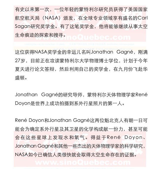 Jonathan Gagné兴奋地说,他在华盛顿将接触到一些功能非常强大的科研仪器,比如说Twin Magellan天文望远镜。全世界现在只有华盛顿Carnegie科学研究院才拥有这种天文望远镜。借助于它,Jonathan Gagné可以更好地观测分布在太阳系之外,远离地球的那些令科学家们为之痴迷的行星。在那些行星上,很可能就有适合生命生存的环境。 在一次科学家圆桌会议上,NASA科学部主任Ellen Stofan宣称,她相信再过10年,人类就会发现重要的太空生命痕迹,而取得太空生命存在的正式证据,则需要二、三十年时间。宇航员John Grunsfeld补充说,他们这代人将会是发掘太阳系及系外行星生命痕迹的一代人。 |