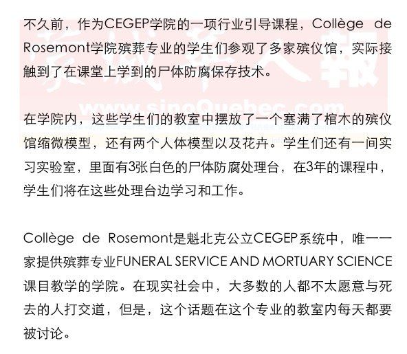 一年级学生Shany Heine表示,他们的一位老师曾经在课程一开始的时候就告诉他们一个道理,但是直到现在她才意识到老师说的是什么:只有从事殡葬行业的人才完全了解死亡,因为他们每天都会和死亡打交道,所以他们更加热爱生命。Heine今年21岁,她说,学习得越多她就越能确信,这是一个她要在今后从事的职业,她希望能在将来的某一天自己开办一家殡仪馆。 来这里学习这个专业的学生们来自魁北克各地,但是其中仅有占一小部分比例的人与殡葬行业有关联。这个专业的项目协调人及教师Sophie Benoit表示,学生们经常会错误地认为,如果他们与尸体打过一次交道,他们就能知道这个项目对他们是否合适,他们是否能够应对它。Benoit说,死亡是一种人们都习以为常的事情,但长久以来,人们已经习惯于惧怕死亡,而且每个人都害怕死亡。 Benoit表示,即使是对那些申请这个专业并且想要以此为职业的学生来说,他们同样也害怕死亡,所有的人在开始的时候都会感到紧张。有些时候,一部分学生在刚开始的时候甚至会产生厌恶情绪,但是,这并不意味着他们会放弃这个专业。学院的教职人员将会建议他们慢慢来,慢慢地去习惯,同时观看他们的同行是如何工作的。Benoit说,如果在数周之后,这种不舒服的感觉一直持续,那么就有问题了,这就意味着这个学生很可能不适合这个专业。 殡葬专业的学生们在最后一学年会到一家殡仪馆实习。在他们的各种各样的课程中包括有心理学,这门课程让他们学到了有关悲痛心理发展阶段,有助于他们与其他人进行沟通。比如说,学生们在参观Maison Montbourquette殡仪馆的时候,学习到了如何为丧失亲友的人提供帮助,并且,学生们在志愿者旁边,学习他们如何通过电话与正在悲痛中的人交谈。 每学期,学生们需要完成25具尸体的防腐工作,这是他们实习内容的一部分。Mallory Bateman说,对她来说感到最困难的,是要为同她差不多年龄的人进行防腐处理。在学校,学生们都是通过生前捐赠的志愿者遗体来学习的。但是有一次,她在为一个和她同龄的人做过处理之后,大哭了一场。Bateman已经到了这个专业的最后一年,她说,她是留下来的仅有的一名女性。 Bateman说,学生们全都是超级乐观的和充满活力的,她认为,从事这个行业的人在一开始的时候必须得要是一个快乐的人,因为在见到死者家人的时候,谁都会不由自主地变得有些悲伤。按照她的说法,从事这个行业必须要充满干劲,实验室工作绝对是一件体力活。 殡葬行业这个一度曾经是由男性支配的领域,已经发生了一次重大的性别转换。当Benoit在上世纪90年代早期学习这个专业的时候,男性要比女性多一点点,而后情况一直在发生变化,到了现在,在她的学生中,男性所占的比例最多只为20%。 Benoit表示,有某些任务,对女性来说是复杂的,因为她们毕竟无法有与男子一样的体力。比如说,将逝者的遗体运回殡仪馆,对女性来说通常都会非常困难。但是,这并不意味着女子就不能做遗体运输工作,不过她们必须要有强壮的体格,否则雇主就会将这类的工作交给男性去完成。Benoit说,将尸体从防腐处理台移送到棺木的过程中,可以使用机械设备,但是其他的工作,就要靠手臂的力量了。 这个专业的学生们大都看过广受赞誉的HBO系列剧《六英尺之下(Six Feet Under)》,这部电视剧讲述的是一个专门从事殡葬服务的家庭的故事,他们遇到的生活琐事、家庭烦恼以及他们的关系和矛盾,展现了一群普通人的悲喜苦乐。在这部电视剧中,那些逝去的人被送到殡仪馆,在那儿生者与死者进行对话,死者回首自己的人生,有庆幸也有牵挂,而生者则会因为死亡而被触动,思索什么才是短暂人生的意义。 |