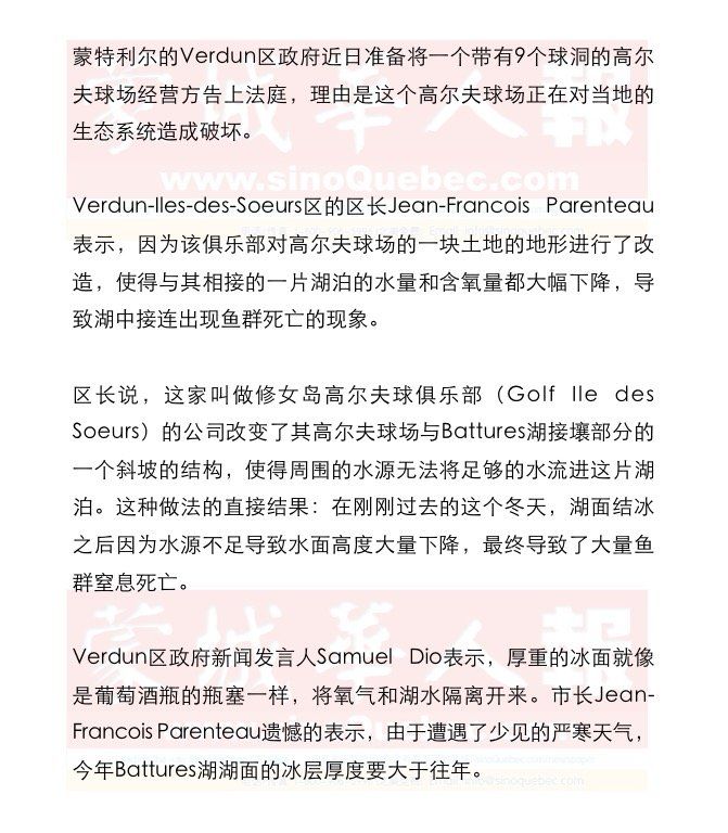 Jean-Francois Parenteau说,魁省环境部授权修女岛高尔夫球俱乐部对这个斜坡进行改造,但前提是该俱乐部必须在旁边安装一台功率足够大的水泵,以帮助把足够的水注进Battures湖中,但是该俱乐部从来没有安装水泵。 具有讽刺意味的是,修女岛高尔夫球俱乐部在广告中将自己的高尔夫球长形容成为一个“都市中的绿洲”。该俱乐部拒绝就这个问题接受任何形式的采访。 根据一份由本地媒体得到的资料,在2007年,Verdun区政府曾经和Island Golf Group公司(通过一份长期租约而拥有修女岛高尔夫球俱乐部所在的高尔夫球场的公司)达成了一份协议,协议规定双方将为安装水泵的工程各支付一半的费用。该工程当时被估价852 872.21加元。 两年之后进行的招标活动之后被取消了,因为投标方提交的合同价格比预计价格高出了12%。 2014年,区长Jean-Francois Parenteau领导的Verdun区政府再次将这个工程拿到了桌面上,但由于高尔夫球俱乐部方面的不配合导致项目不了了之。 区长办公室的Sarah Gagnon-Turcotte表示,就在工程进度因为各种各样的原因而停滞不前的时候,Battures湖的生态系统因为缺水已经被搅了个底朝天。Hérons河以及周围几个与Battures湖相连的小湖已经几近干枯,并散发出了一股臭鸡蛋的气味。 近日,大量的死鱼浮出水面导致铺天盖地的海鸥前来觅食,让Battures湖的问题再次暴露在了公众的面前。 修女岛居民及业主协会会长最近将Battures湖的问题反映给了魁省环境部。环境部随后委派了一组专家前往现场对问题进行评估,而Verdun区政府不得不派出大量蓝领工人回收湖面上的死鱼。 至此,区长Jean-Francois Parenteau已经彻底被高尔夫球俱乐部方面的不合作态度激怒了,他决定带领区政府独自展开招标来为Battures湖安装一台水泵。他修女岛的居民们保证,工程会在今年夏天结束前完工,而区政府将独自承担工程费用。为此,区政府已经预留了150万加元的资金用于完成这项工程。 |